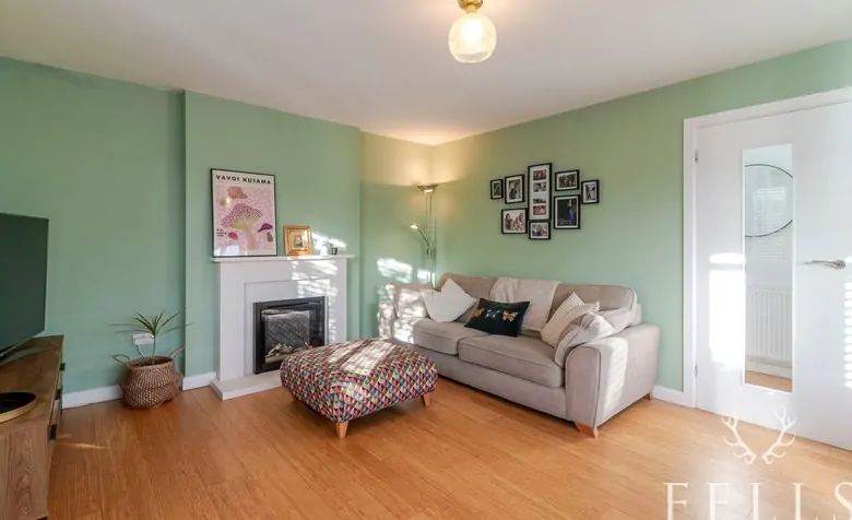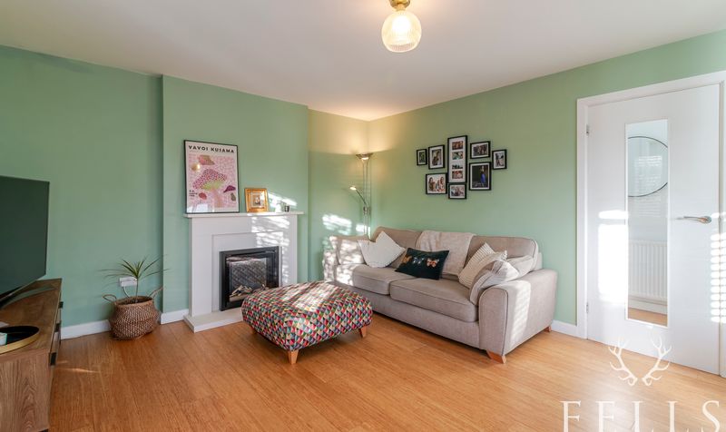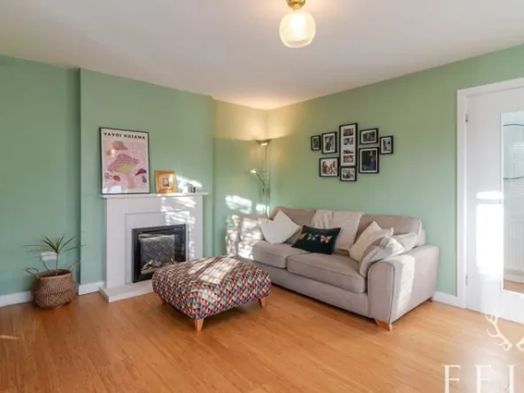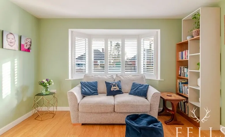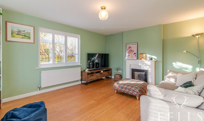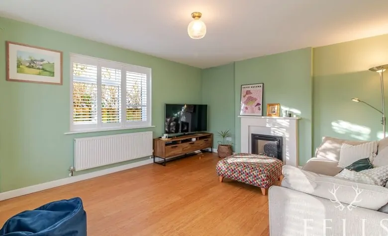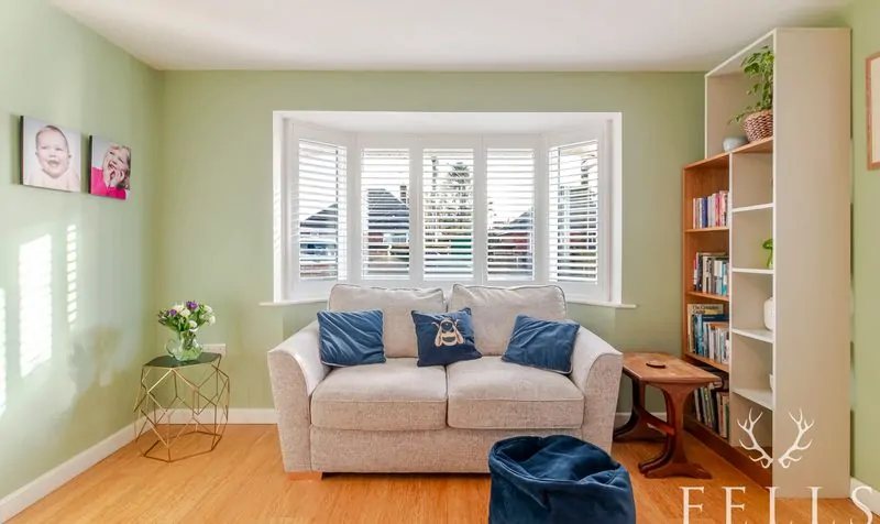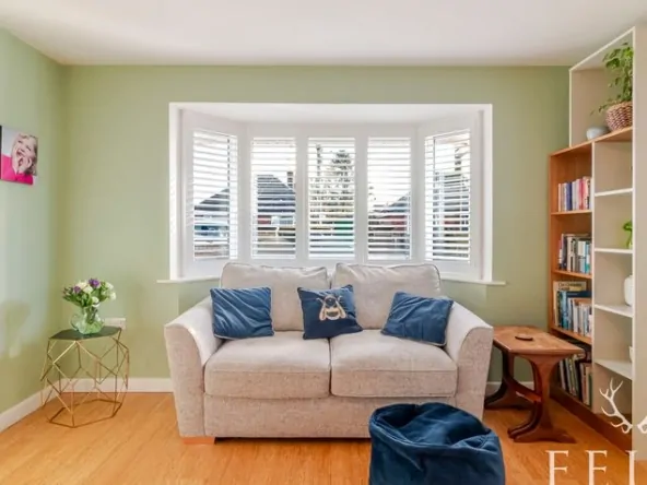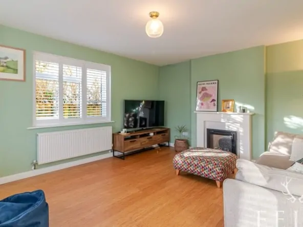 The living room is a generous, light filled space with windows to two aspects, including a front bay. Plantation shutters add both style and privacy, while a stone surround electric fireplace provides a refined focal point for relaxed evenings or entertaining.