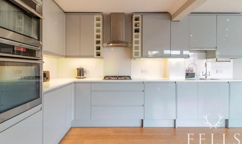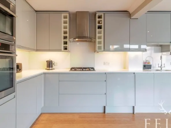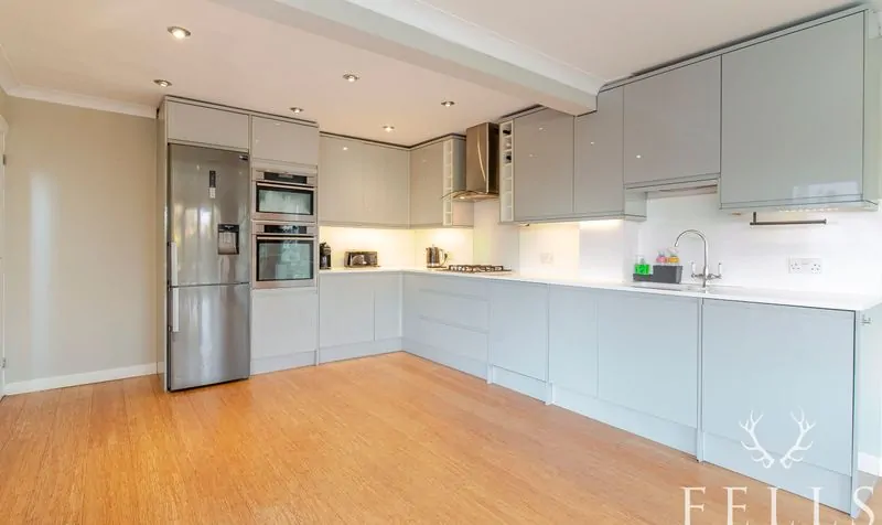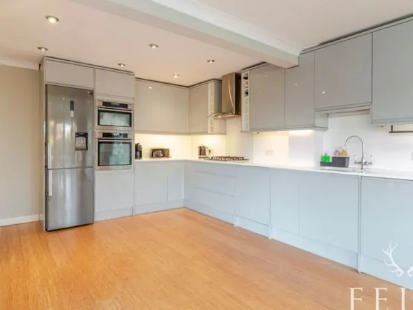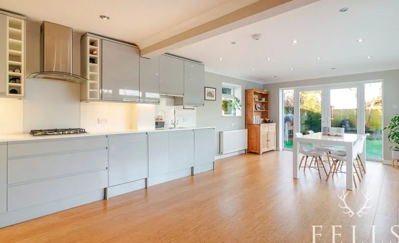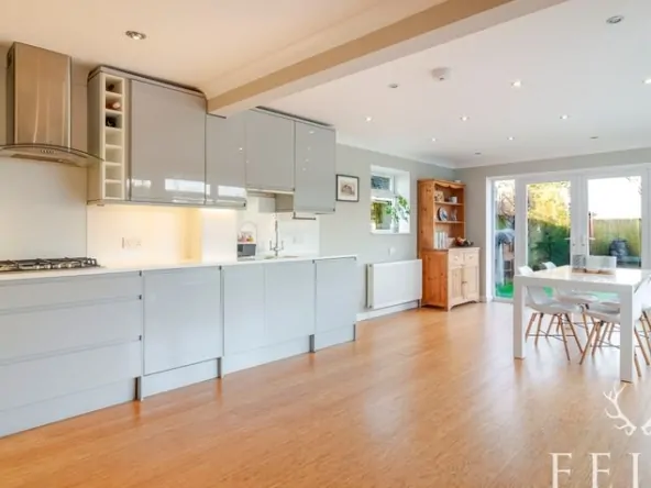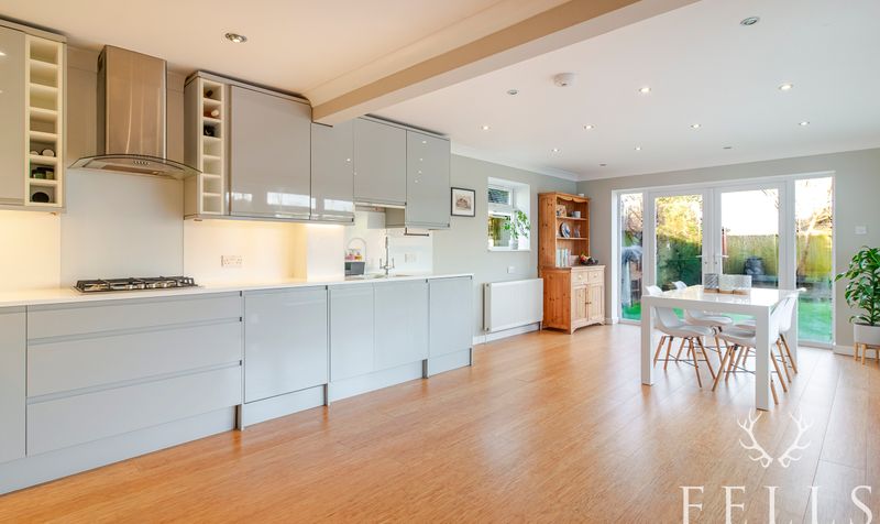 To the rear, a further reception currently used as a study offers excellent proportions and a peaceful outlook over the west facing garden. This room could easily function as a fifth bedroom if required, making the layout highly adaptable. The kitchen dining room is the heart of the home, designed to connect daily life with the garden beyond. Handleless cabinetry, corian worktops and integrated appliances create a sleek modern look, while expansive glazing draws in natural light and greenery. With space for a large dining table and doors opening directly onto the patio and lawn, it is a wonderful space for family life and entertaining.