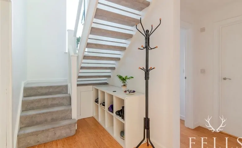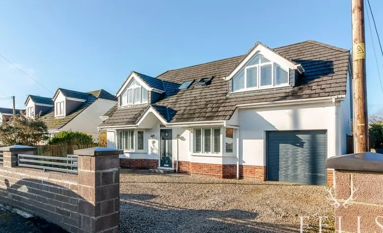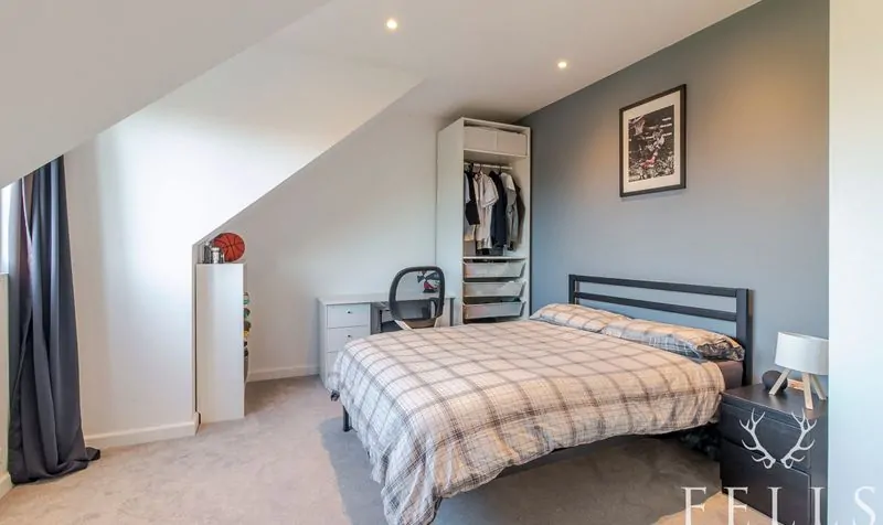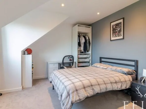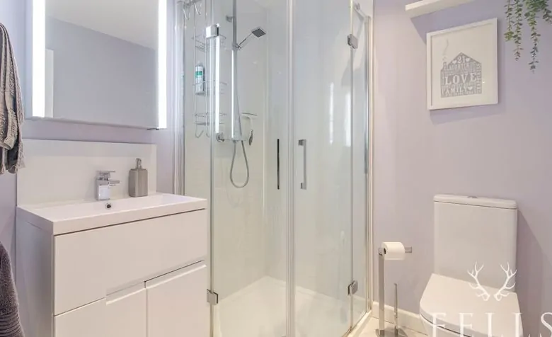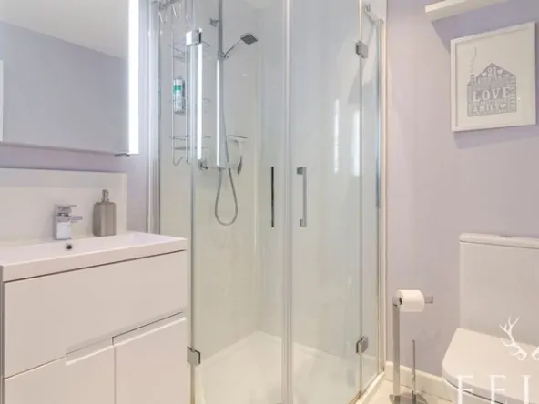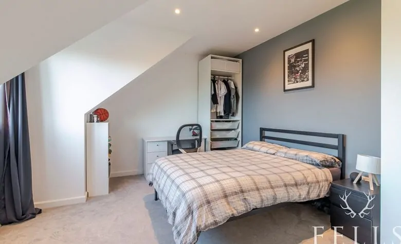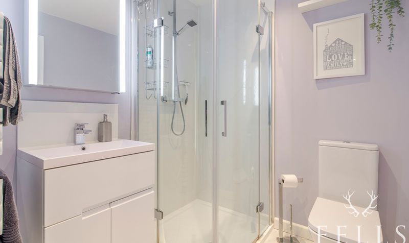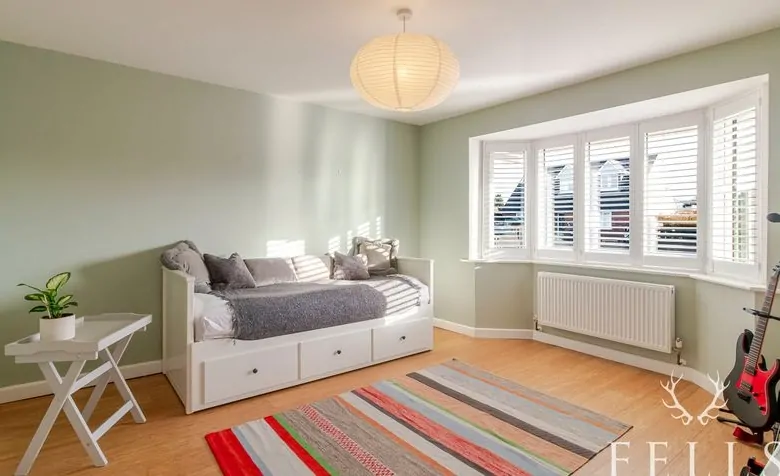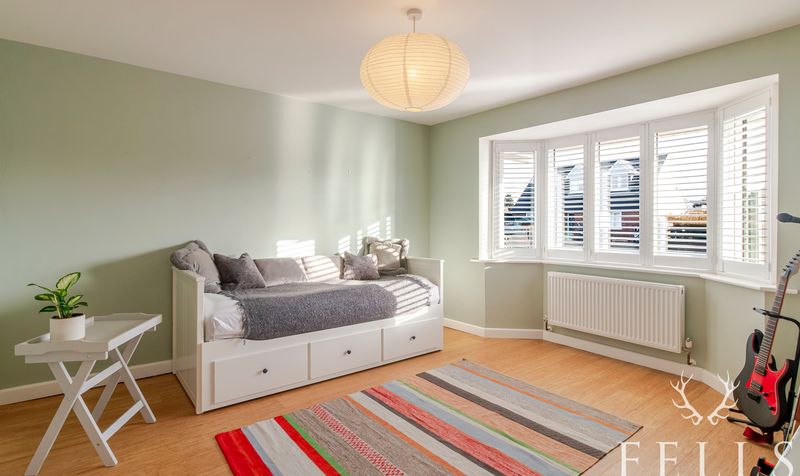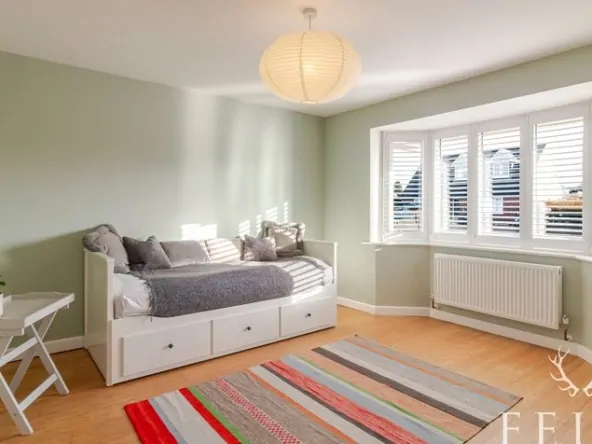On the opposite side of the house, a versatile snug is currently arranged as a cosy retreat but could comfortably serve as a double bedroom, enhanced by a bay window and plantation shutters. A stylish ground floor shower room adds valuable flexibility, ideal for guests or extended family living.