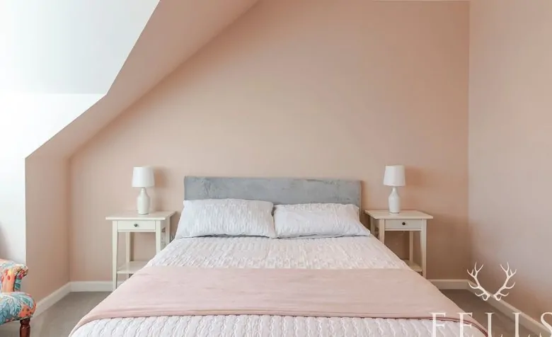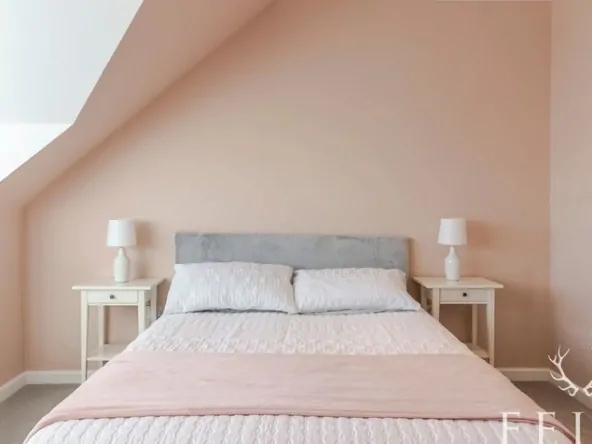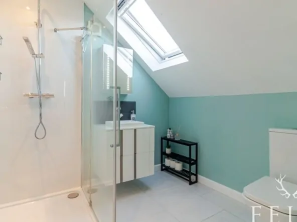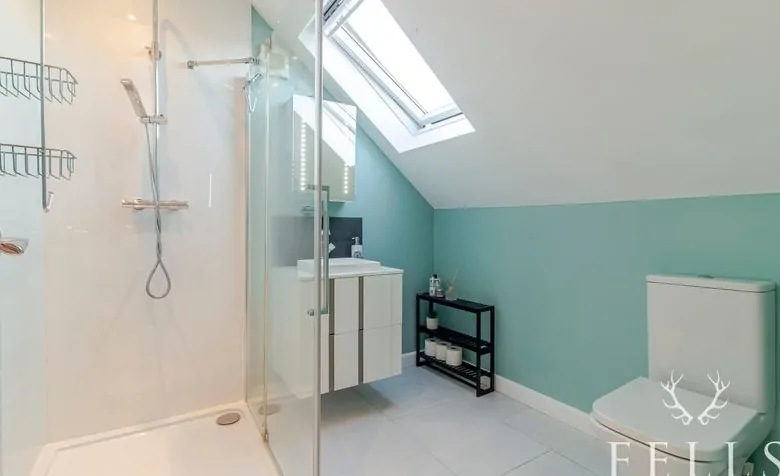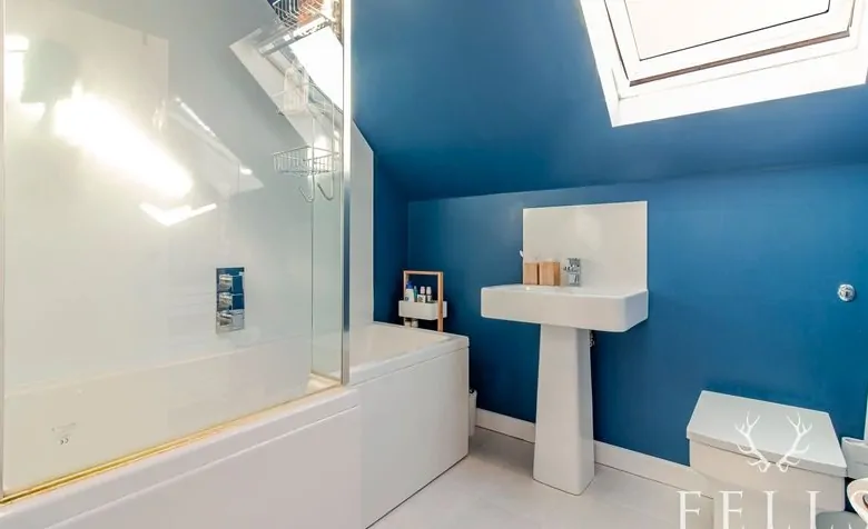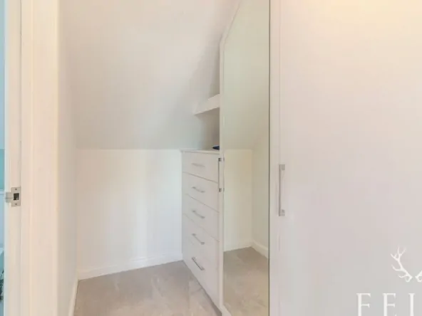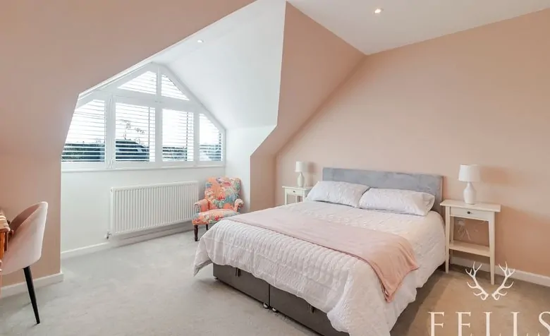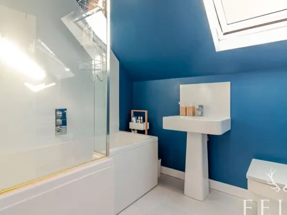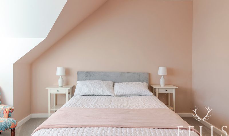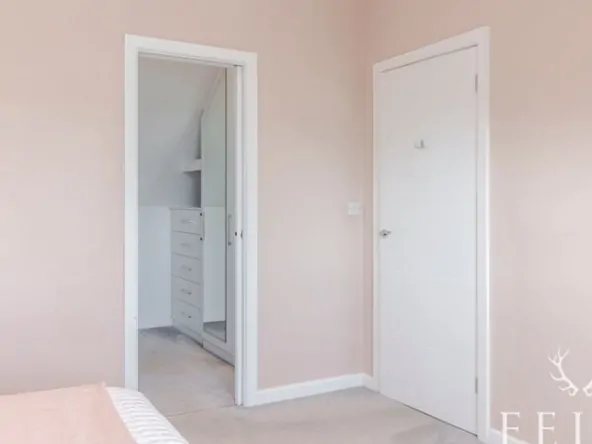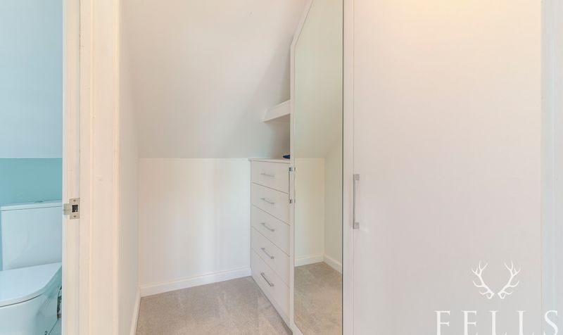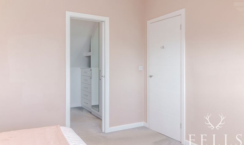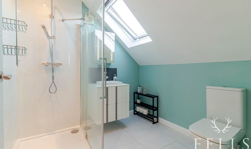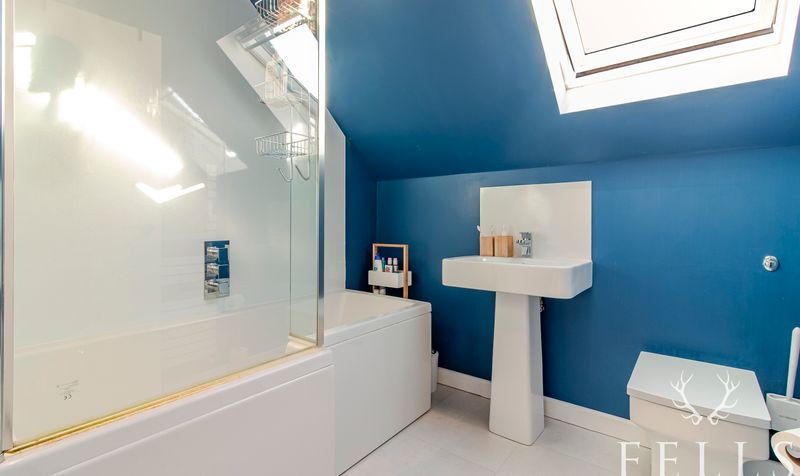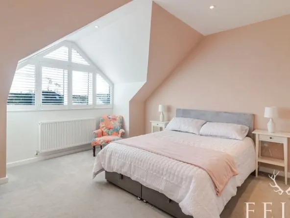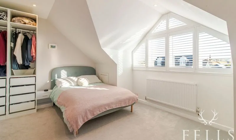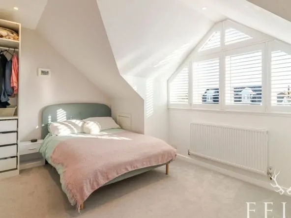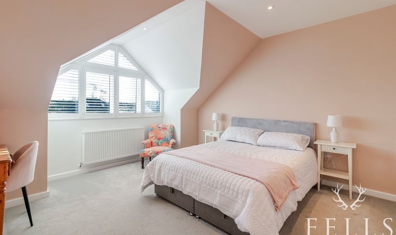 Upstairs, the landing leads to three well proportioned double bedrooms and the main bathroom. The principal suite feels like a private retreat, with an apex window, plantation shutters, a dedicated dressing area and a beautifully finished en suite shower room. Bedrooms two and three both enjoy eaves storage and pleasant outlooks, while the family bathroom features a distinctive pear shaped bath and contemporary fittings.