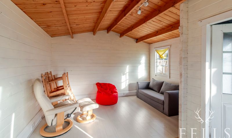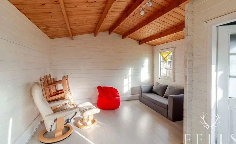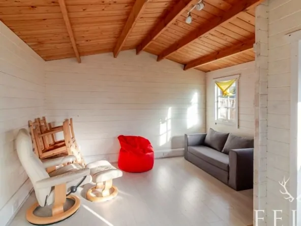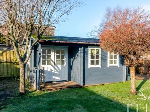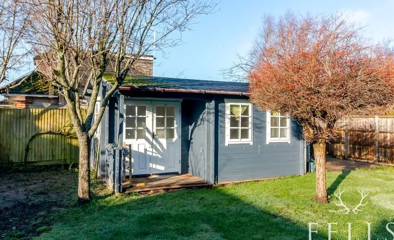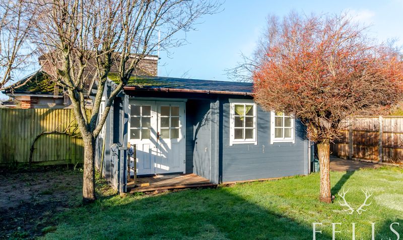 The rear garden offers a generous patio leading to lawn, mature planting and a timber chalet with power and lighting, ideal as a hobby room or garden retreat. A further seating area at the end of the garden captures the evening sun. To the front, gated access opens onto a stone driveway providing parking for several vehicles and leading to a single garage with power, lighting, plumbing and useful storage.