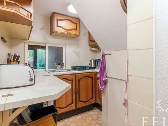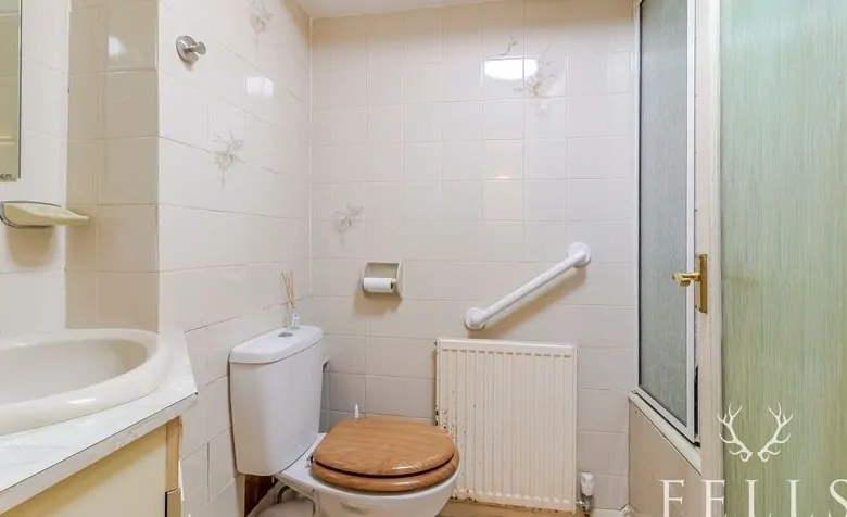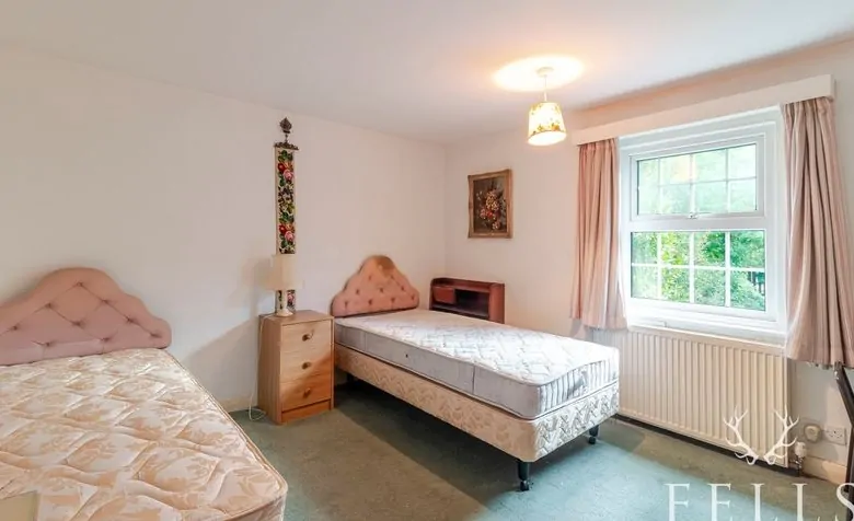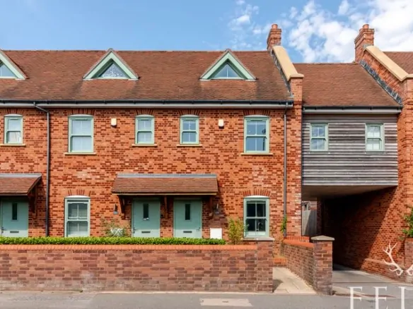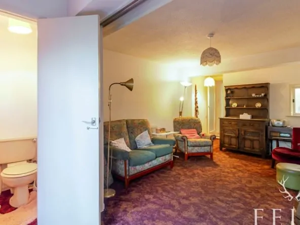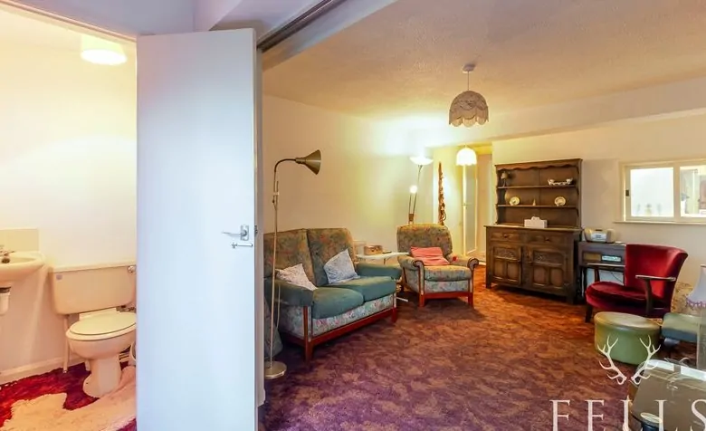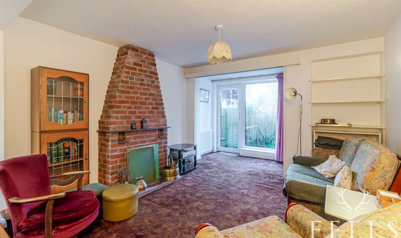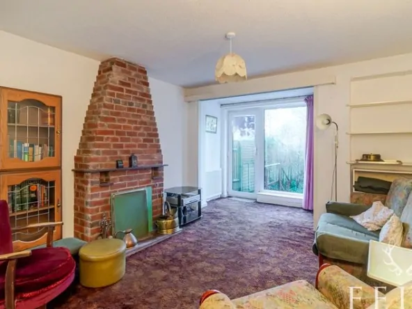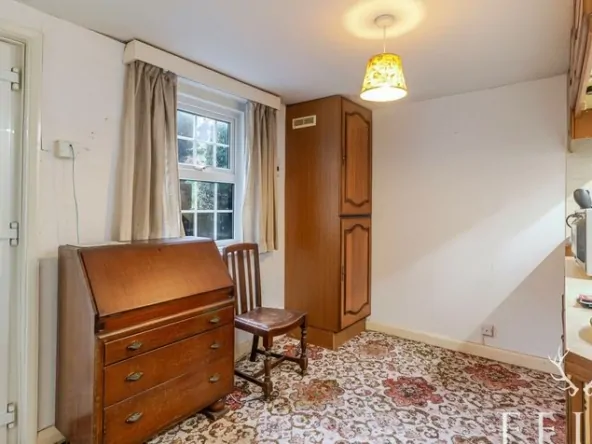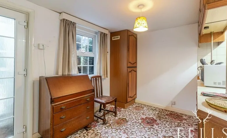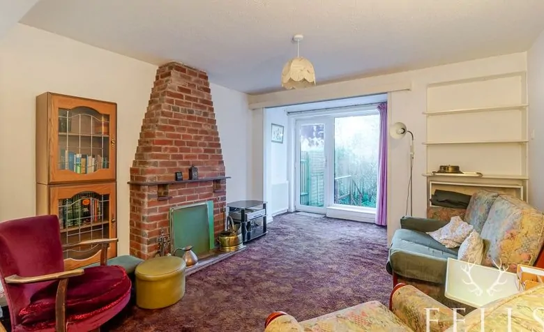 A small inner vestibule leads to the staircase and through to the living room where the cottage’s warmth truly comes alive. The exposed brick chimney breast provides a rustic focal point and the space includes a deep double cupboard for coats and everyday essentials. A picture window frames the rear garden and the green beyond and a glazed door opens to the steps that lead down outside. Discreetly placed in the corner is the downstairs cloakroom with its own little window overlooking the garden.