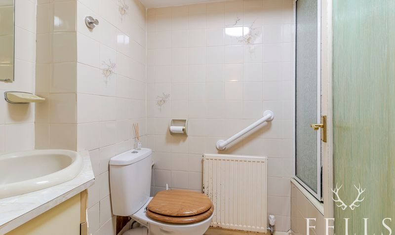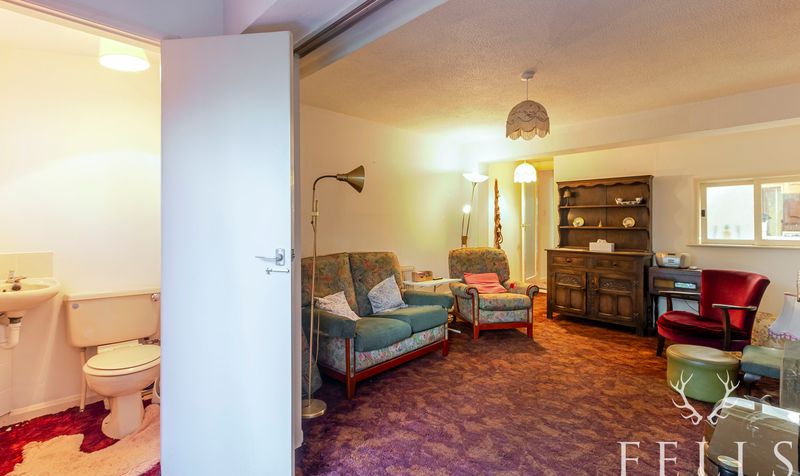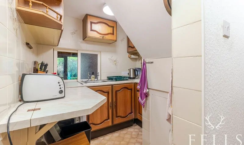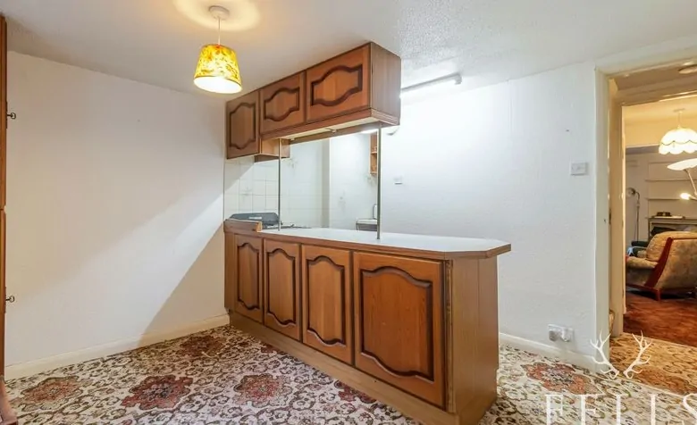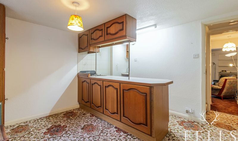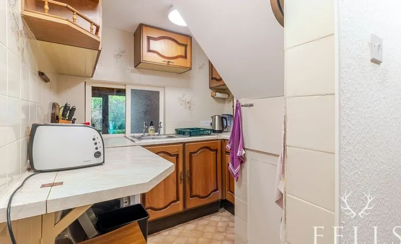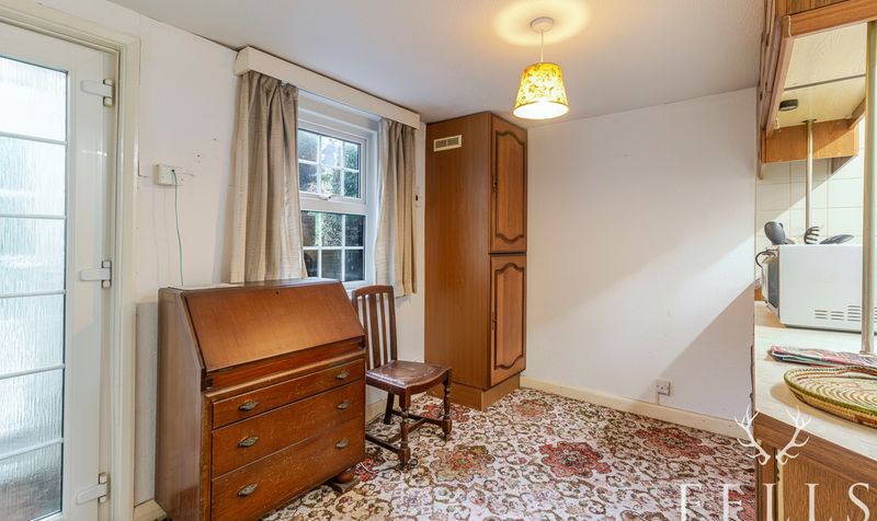 Stepping through the porch, the kitchen dining space forms the heart of the home. It is a practical and welcoming area with a selection of classic cupboards, a peninsula breakfast bar for relaxed meals and a four ring hob with oven beneath. Tucked neatly under the stairs is the stainless steel sink and a useful spot for a washing machine, along with a serving hatch that peers into the living room. A slim storage cupboard houses the electric meter and consumer unit and a tall cupboard conceals the Worcester boiler.
