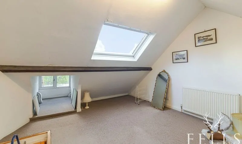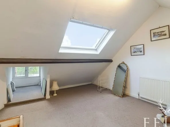 Upstairs, the landing offers several storage options including an airing cupboard and shelving above the staircase. Both bedrooms are generous doubles. The rear bedroom enjoys an outlook across the garden and adjoining field, while the front bedroom looks over the cottage garden and the sheltered approach. The bathroom is simple and functional with a bath, shower attachment and full tiling. A pull down ladder leads to the converted loft which provides a flexible ancillary space with deep eaves cupboards, a skylight and a rear facing window.