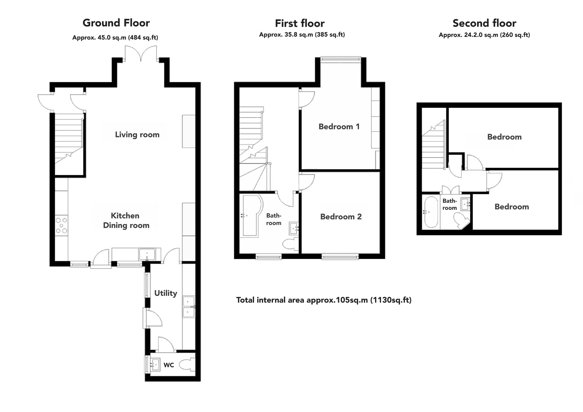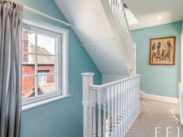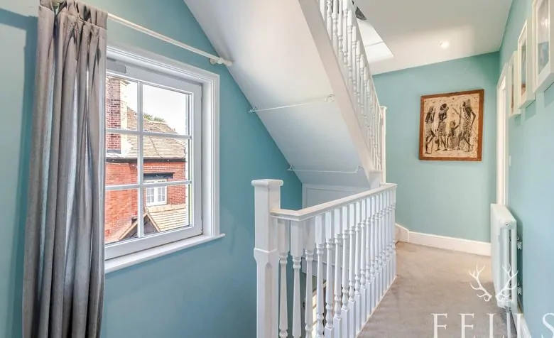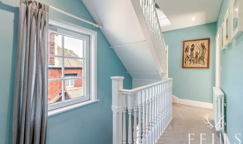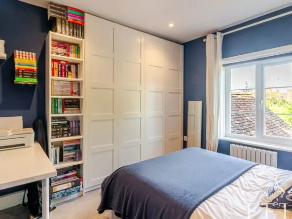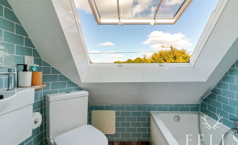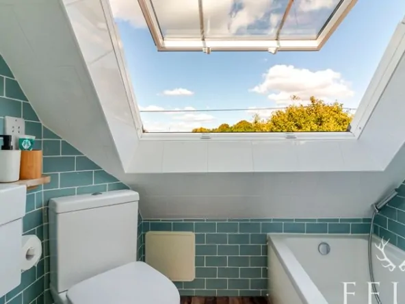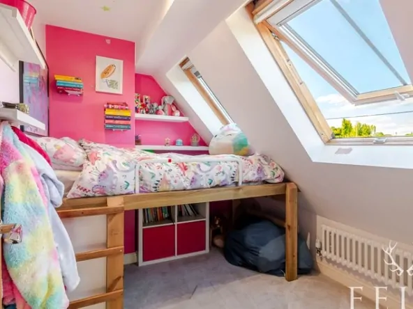 Upstairs, the master bedroom is a serene retreat with fitted wardrobes and a window seat overlooking the rear garden. A second double bedroom features fitted wardrobe storage, while the modern family bathroom is finished with an L-shaped bath, overhead shower, and contemporary fittings. On the top floor, two further bedrooms with Velux windows and a second bathroom create ideal children’s rooms, with the flexibility to serve as a study or guest space.