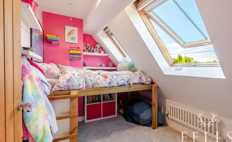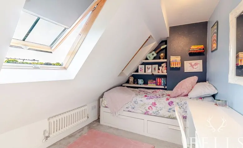Bright single bedroom with Velux window, perfect for a child’s room or study.