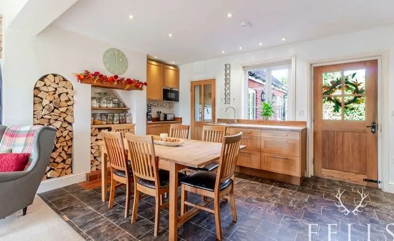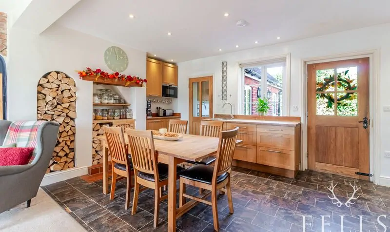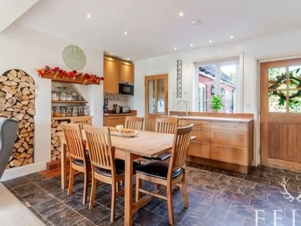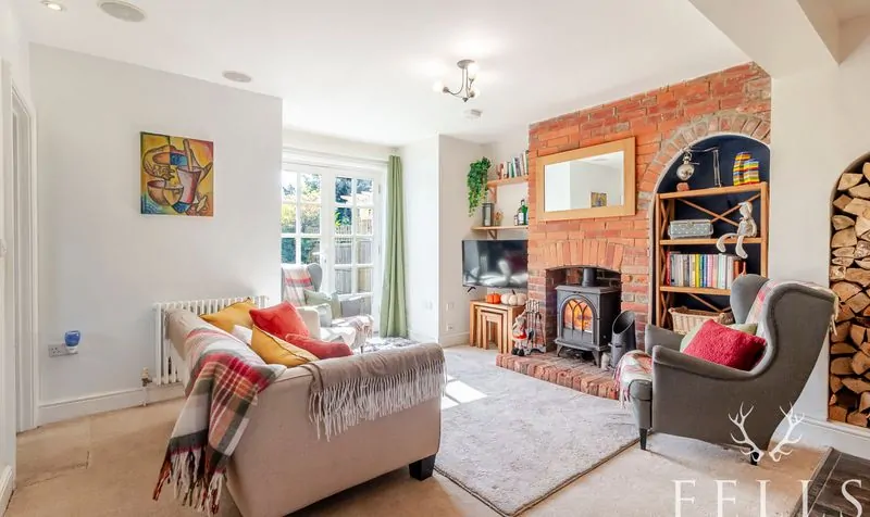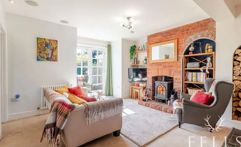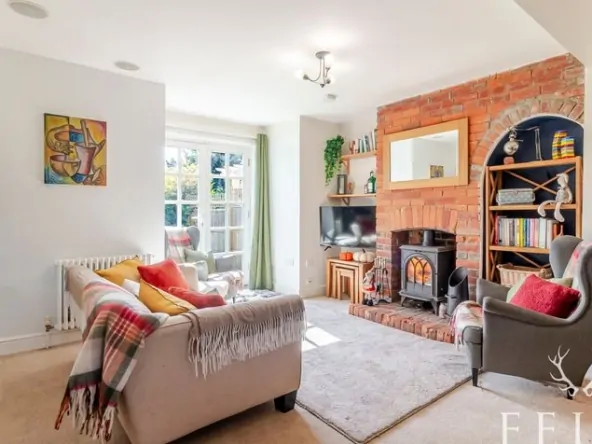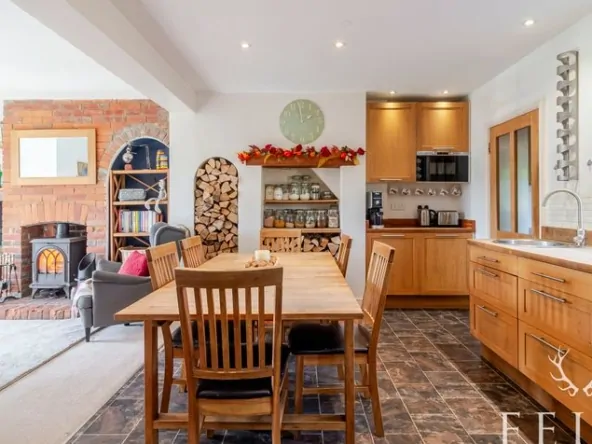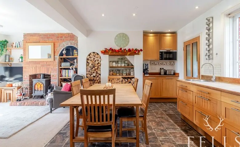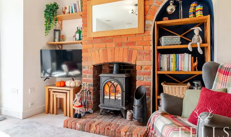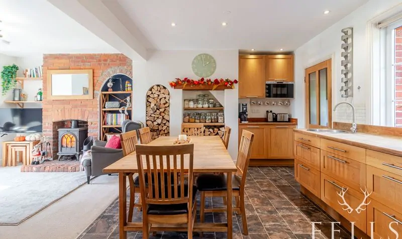 As you step inside, the home immediately feels warm and inviting. The open-plan kitchen and living room forms the heart of the property — a cosy yet stylish space with a feature log burner and exposed brick wall, perfect for family evenings or entertaining friends. The kitchen is both practical and charming, with oak-effect units, an AGA-style cooker, integrated appliances, and room for a large dining table.