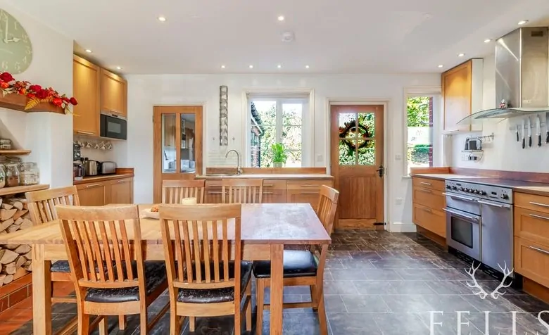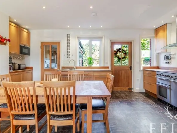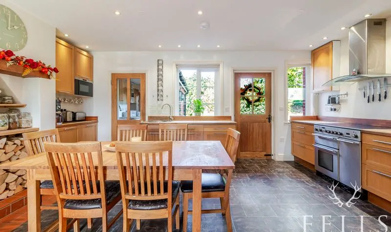 Stylish oak-effect units, AGA-style oven, and space for a large dining table make this kitchen ideal for family life and entertaining. Glazed door through to utility and cloakroom