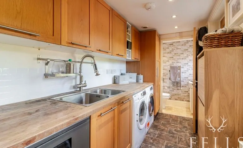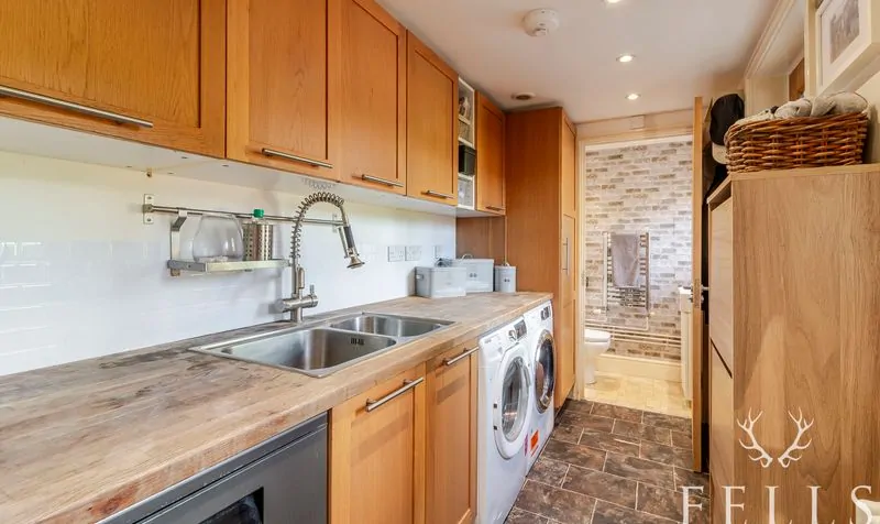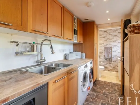 Generously sized with storage, sink, and room for appliances — perfectly suited to busy family living. Door to downstairs cloakroom with WC and wash basin.