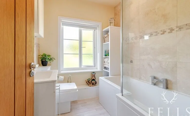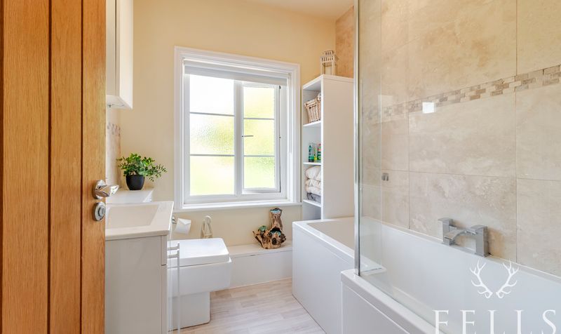 Contemporary second bathroom with WC and wash basin, serving the top floor bedrooms with wonderful country views.
