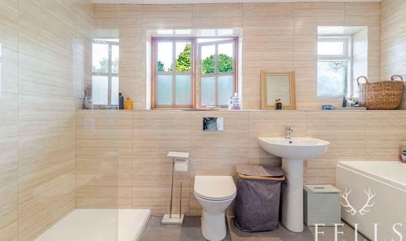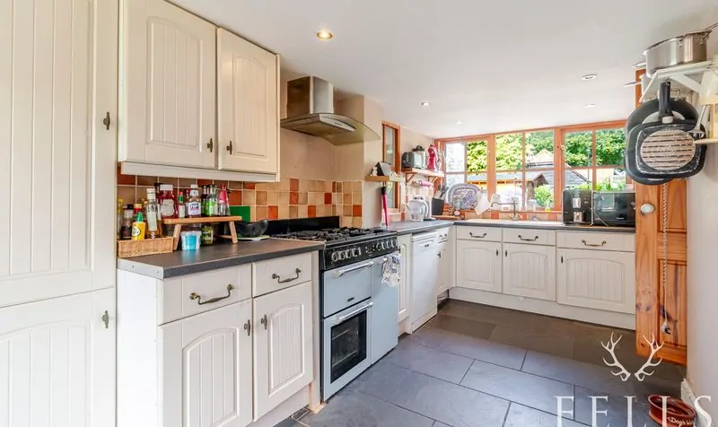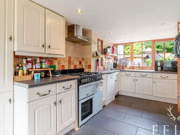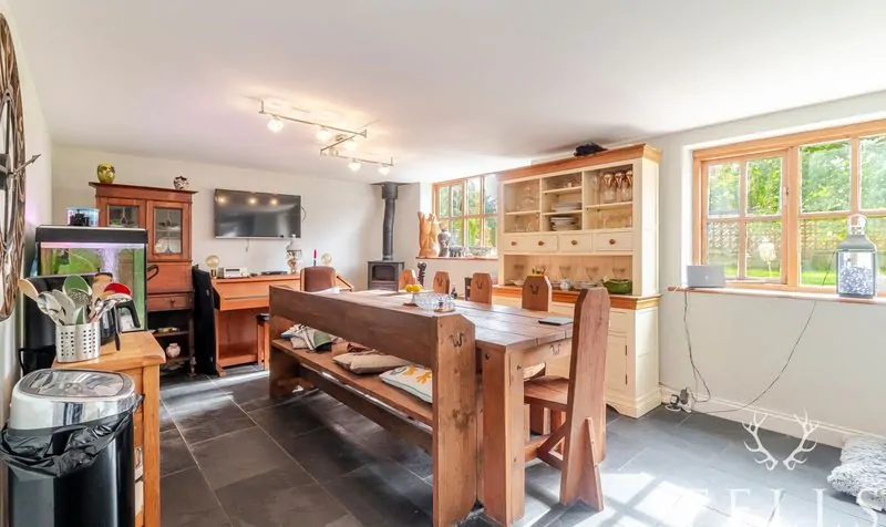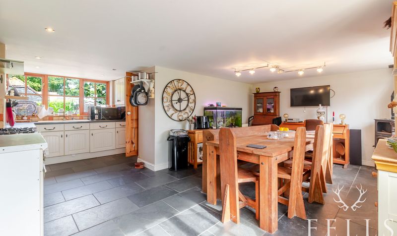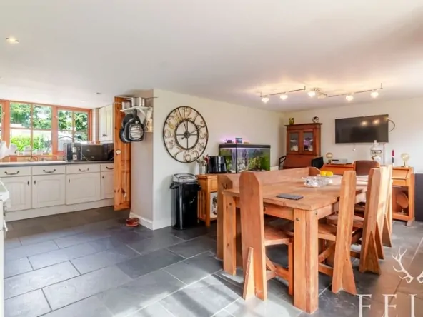 The kitchen dining room is very much the heart of the property. Its L-shaped design allows plenty of space for a large table, while windows to the front and rear fill the room with natural light. A feature woodburning stove in the dining area adds warmth and atmosphere, and the adjoining utility room provides practical space for appliances, with a stable door leading directly to the garden.