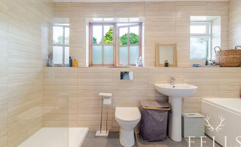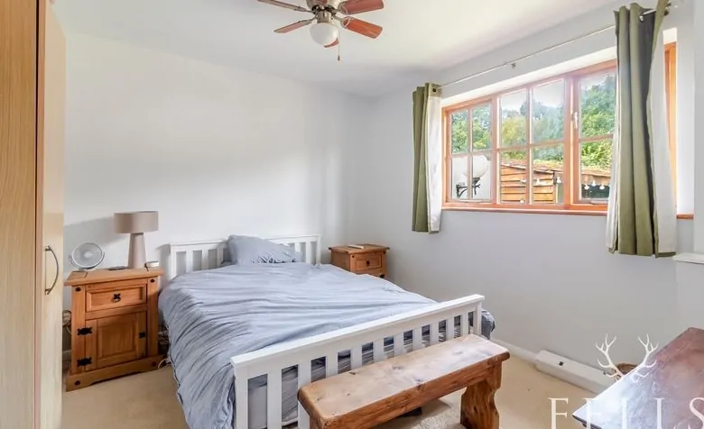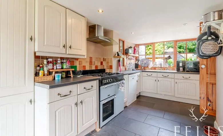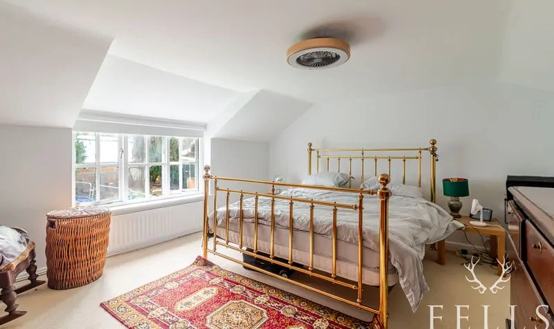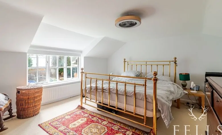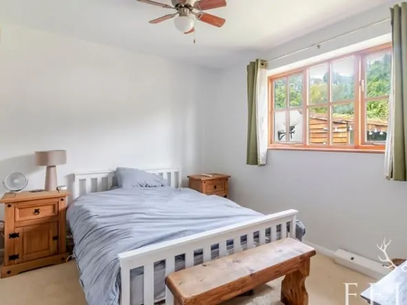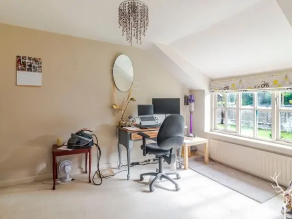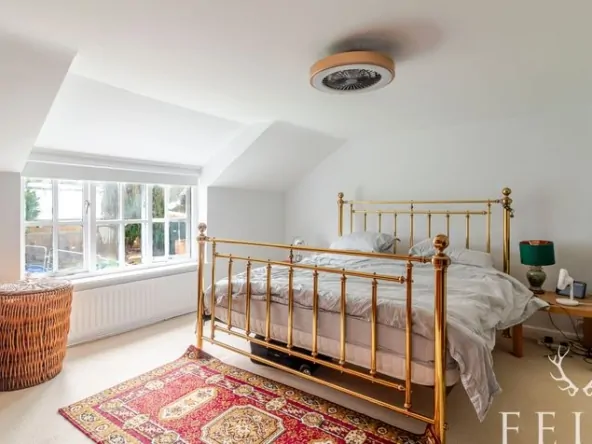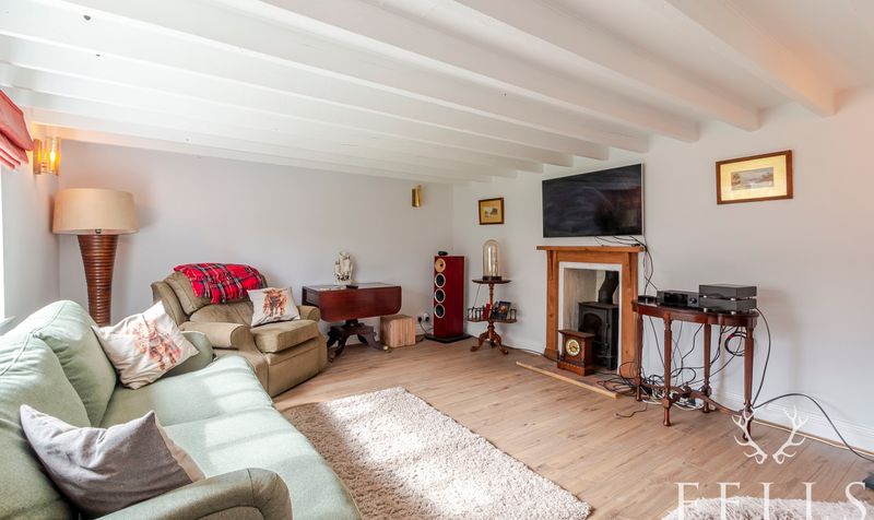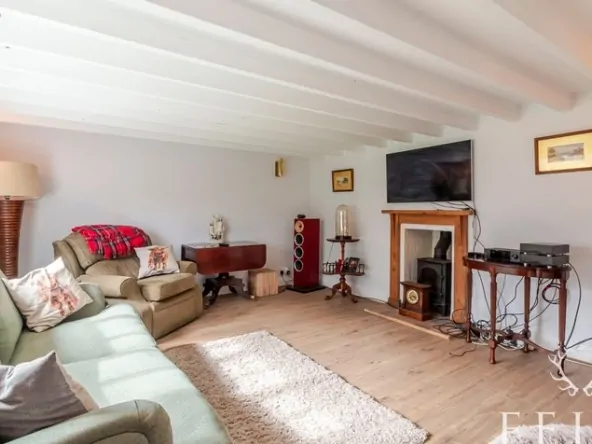 The living room is another standout space, with exposed painted beams and a woodburning stove creating a welcoming feel. A ground floor bathroom offers both bath and walk-in shower, while a double bedroom overlooking the garden adds flexibility for guests or ground floor living.