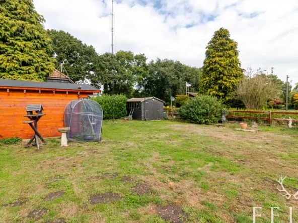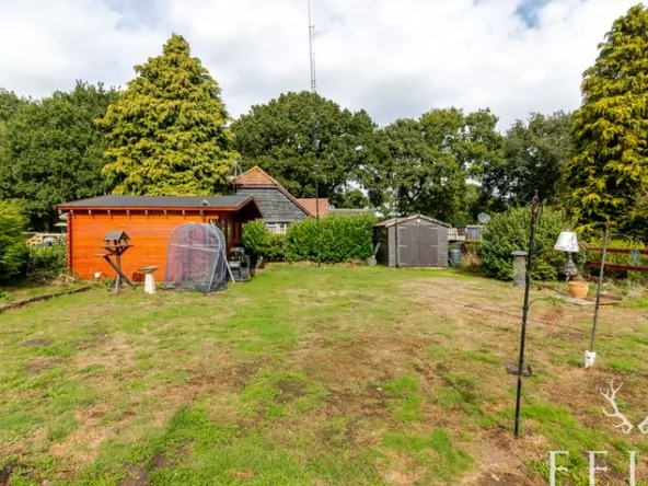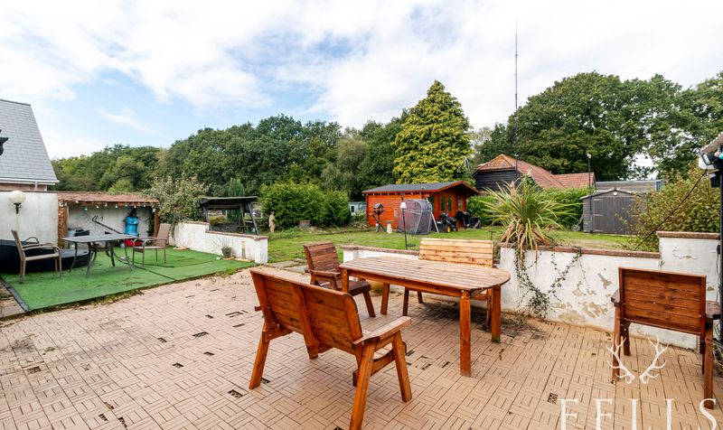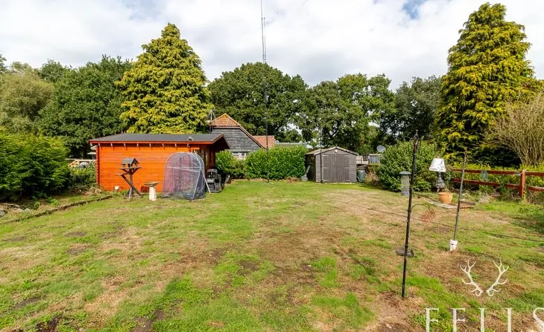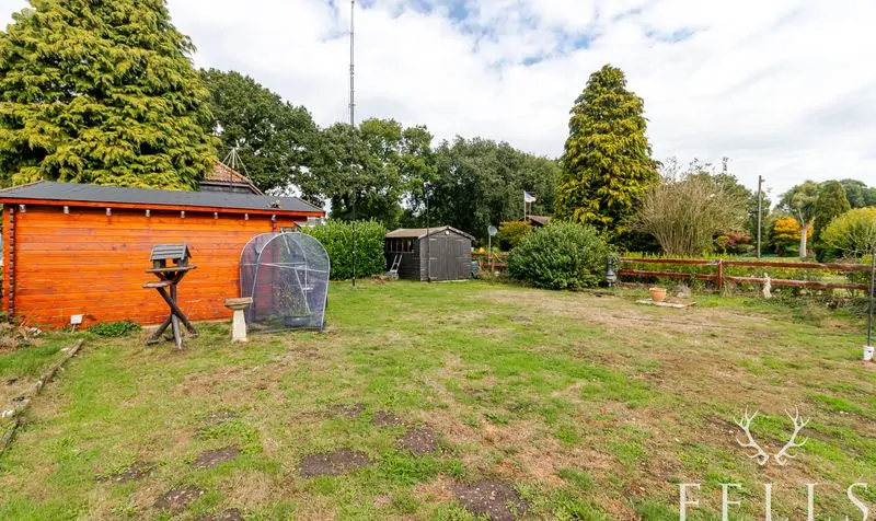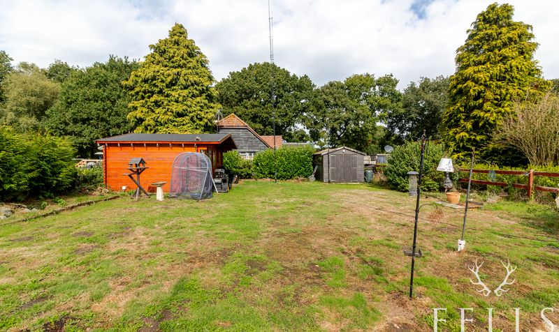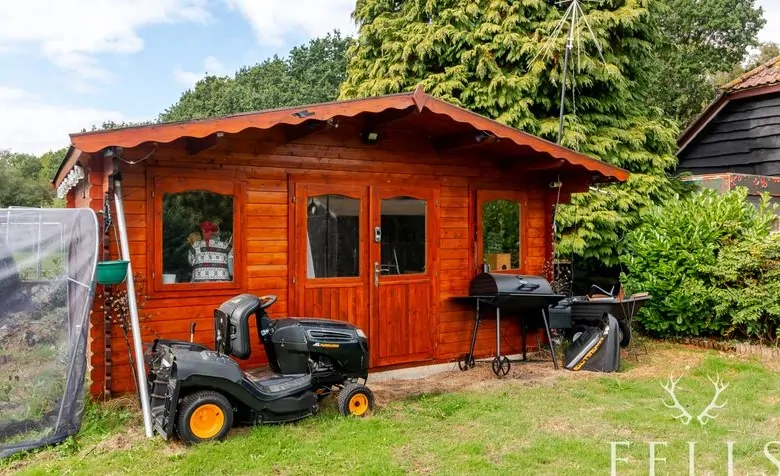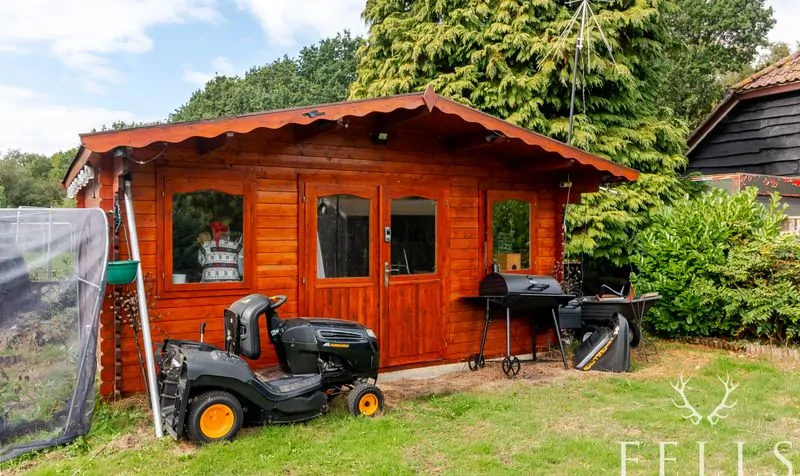 The garden extends the lifestyle appeal, with a patio enclosed by a low wall, ideal for outdoor dining beside the wood store. Beyond lies a wide stretch of lawn with mature shrub borders, a timber shed and a well-constructed chalet with power and lighting, making an excellent office or studio. The front of the property provides lawned garden space, shingle and driveway parking.