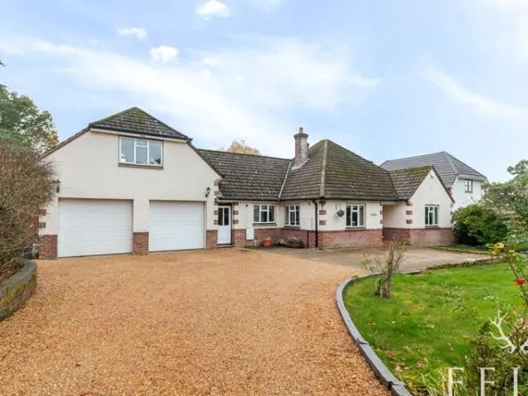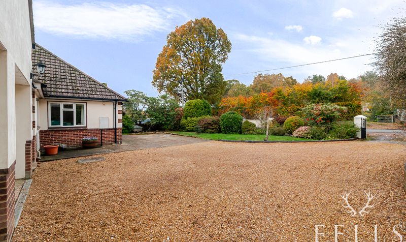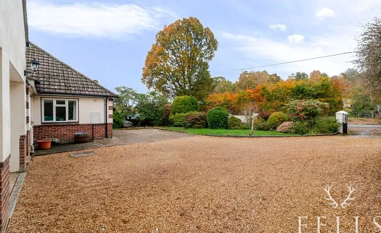 To the front, the garden is equally appealing, filled with colourful perennial planting from spring through to autumn. The extensive gravel driveway and hardstanding areas provide ample parking — easily accommodating six or more vehicles — and lead to a substantial four-car garage with electric up-and-over doors, power, light, and a workshop space at the rear. A fire door provides direct access through to the utility room, adding convenience to everyday family life.