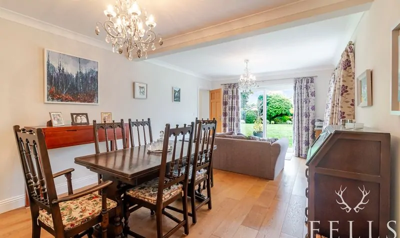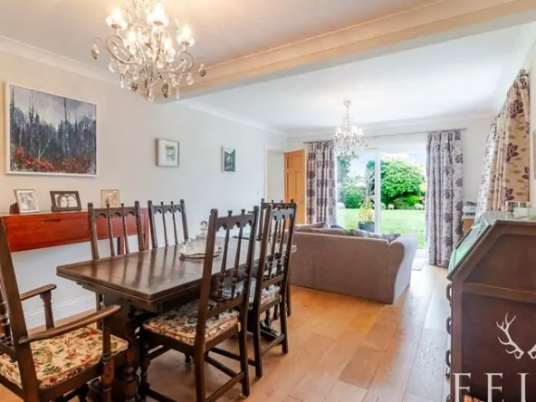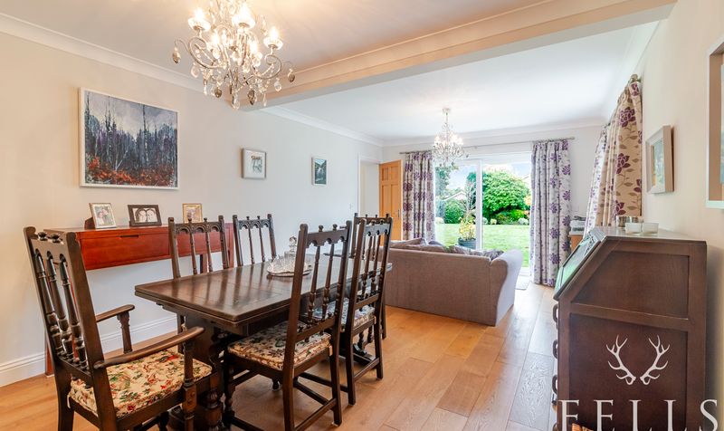 A spacious family / dining room with sliding patio doors leading directly onto the terrace and garden — a perfect space for everyday family life and entertaining.