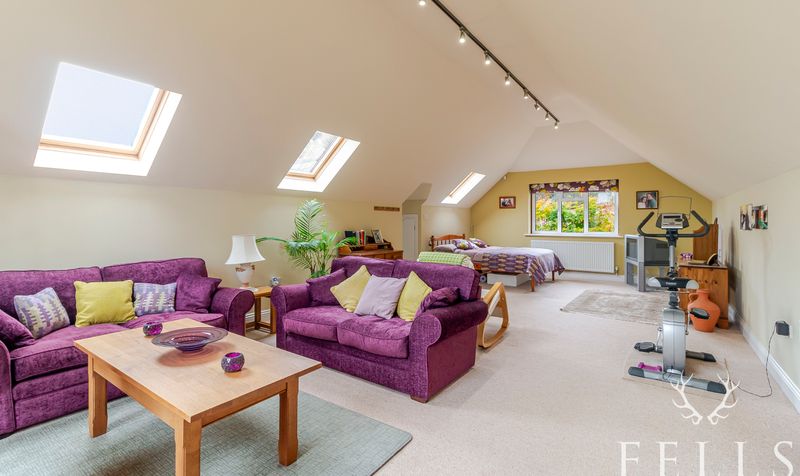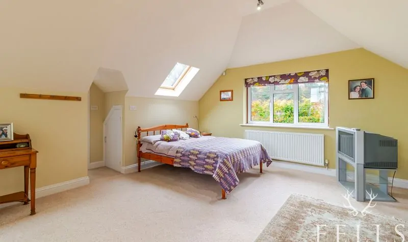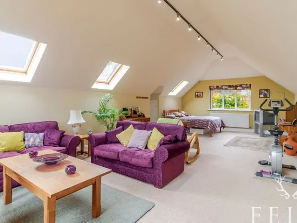 A spacious dual-aspect master suite with views to the front and rear garden. Three Velux windows provide excellent natural light, and there is useful under-eaves storage space.
