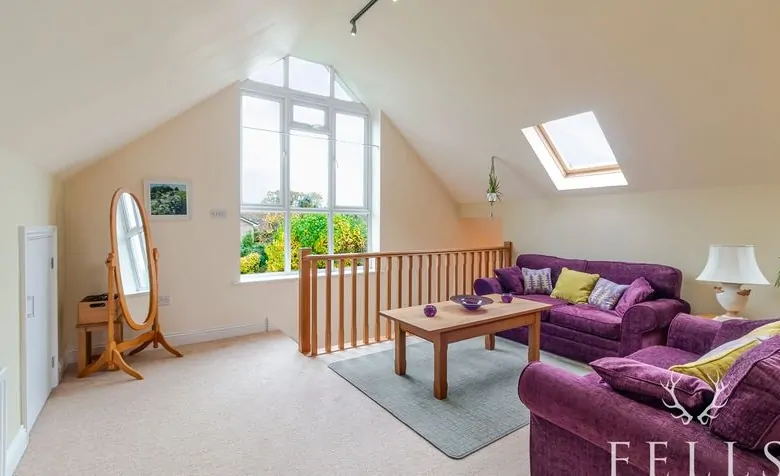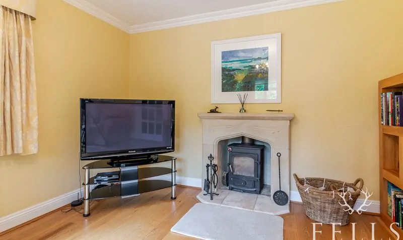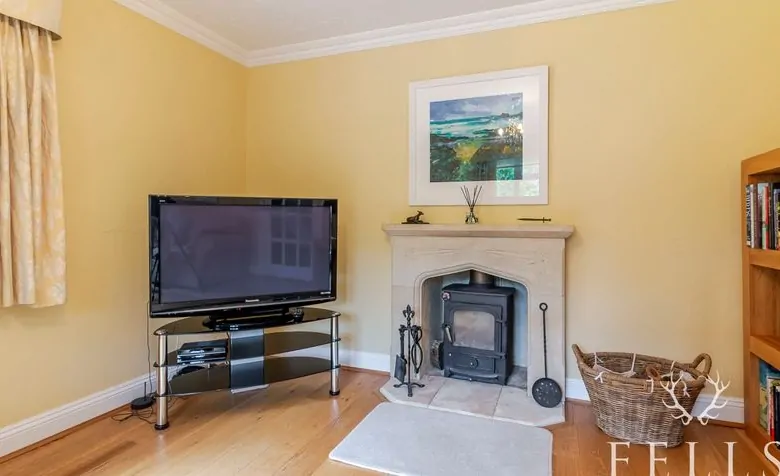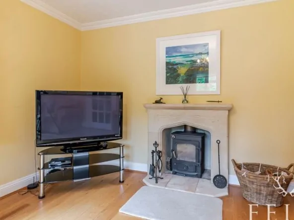 The living room, located at the front of the house, is a cosy retreat with dual-aspect windows and a log-burning stove, providing a warm and inviting space for relaxing evenings.