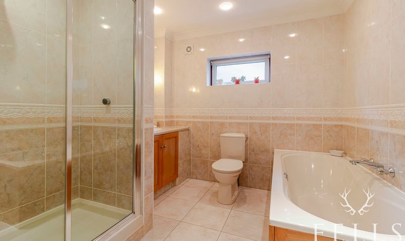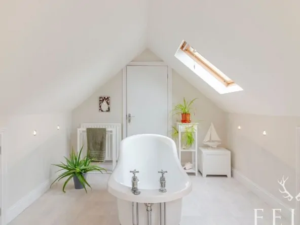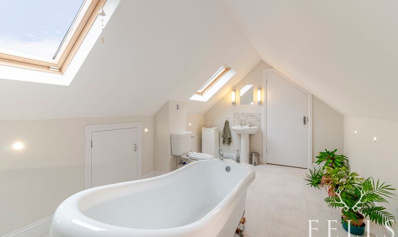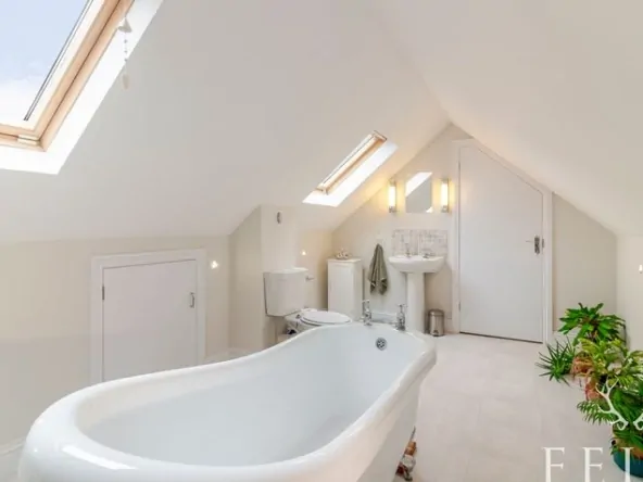 Upstairs, accessed via stairs from the family room, the master suite is a spacious dual-aspect room overlooking the front and rear gardens. Three Velux windows fill the room with natural light, and under-eaves storage adds practicality. The suite is complemented by a luxurious en-suite bathroomwith a freestanding roll-top slipper bath, washbasin, and WC.