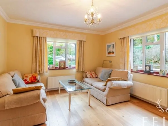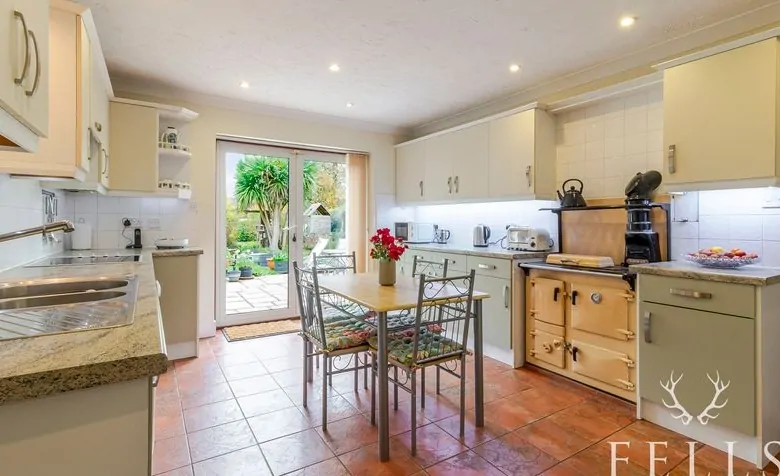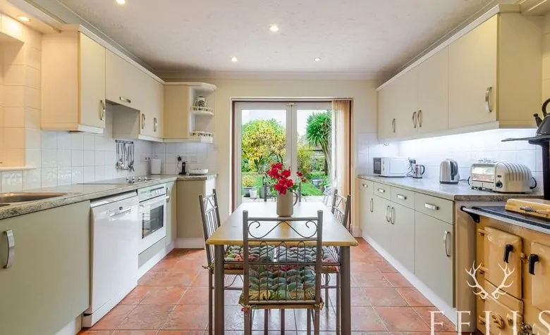 At the heart of the home is the family room/dining area, a bright and generous space with sliding doors opening onto the terrace and rear garden — perfect for everyday family life and entertaining. Adjacent is the kitchen, fitted with a range of wall and base units with accent lighting, a solid-fuel Rayburn, built-in oven and hob, and sliding doors leading out to the rear patio. A utility room provides space for laundry appliances and offers direct access to the front parking area, the family room, and the garage.