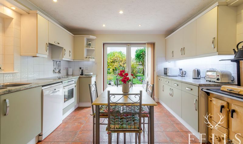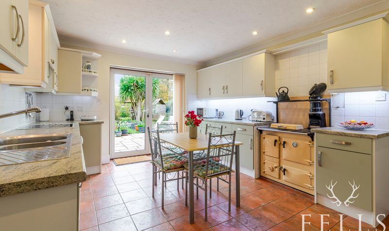 A generous kitchen fitted with a range of wall and base units with accent lighting. Includes a solid-fuel Rayburn cooker, built-in oven and hob, and patio doors opening onto the outdoor dining area on the rear patio.