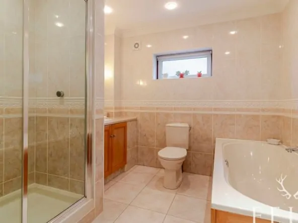 A well-equipped family bathroom featuring a bath, fully enlosed shower with sliding door, washbasin, and WC — practical and suitable for everyday family use.