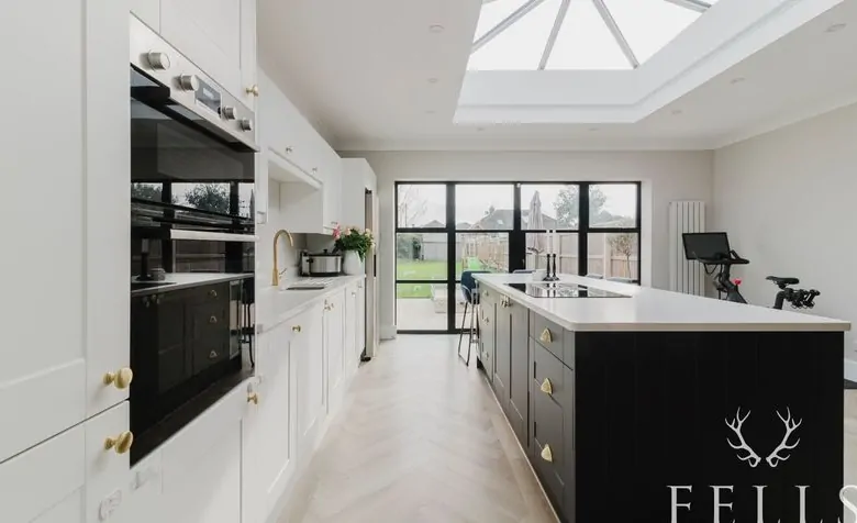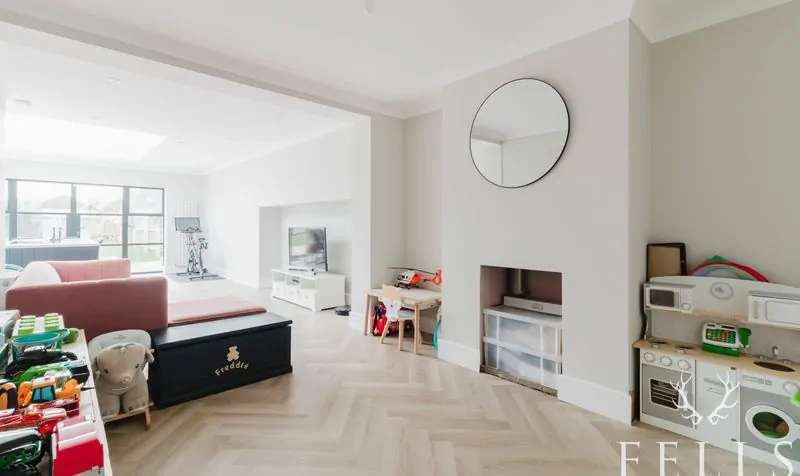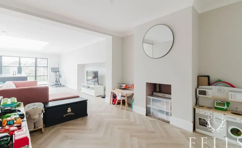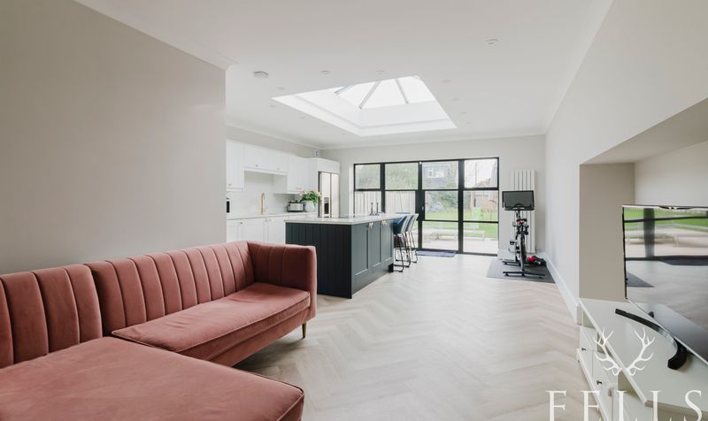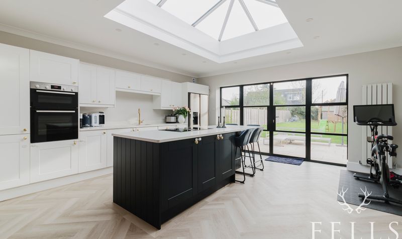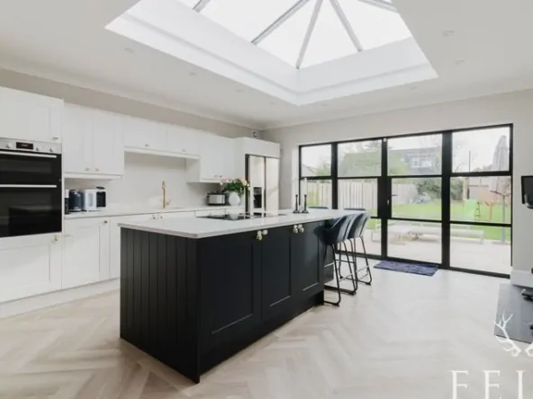 On entering, the hallway leads into the heart of the home, with luxury vinyl tile (LVT) herringbone flooring that runs from the front door to the kitchen at the rear. This open-plan kitchen, snug, and dining area is both spacious and practical, designed for everyday use and entertaining. The kitchen includes a large central island with a downdraft induction hob and a wine cooler, along with seating for four at the island. Additional features include quartz worktops, an integrated electric oven with grill, a dishwasher, and an American-style fridge freezer, all included in the rental. Double-glazed aluminium critter-style doors open from the kitchen onto a porcelain-tiled patio, leading to a large lawned garden ideal for relaxation or family activities.