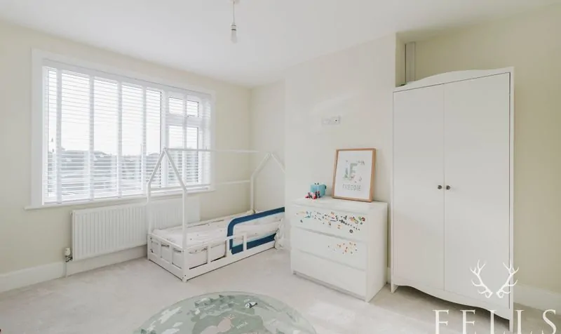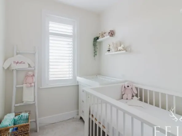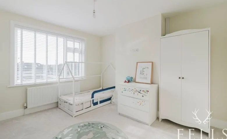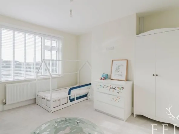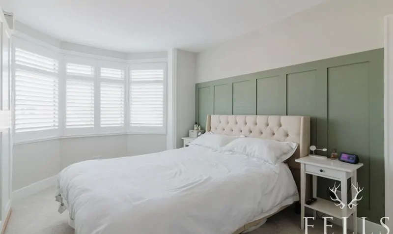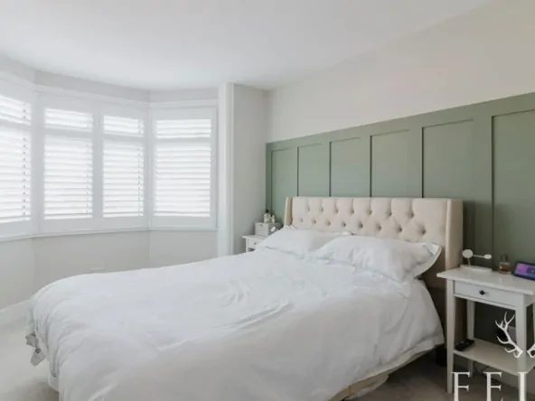 Upstairs, the first floor has three bedrooms and a family bathroom. The primary bedroom, situated at the front of the property, is a double room with a bay window, plantation shutters, two fitted wardrobes, and space for a wall-mounted TV. The second bedroom is also a double, located at the rear, while the third bedroom, a smaller single with plantation shutters, is ideal as a nursery or home office. The family bathroom is fully tiled with marble-effect tiles and includes a walk-in shower, back-to-wall WC, floating vanity unit with a large wall mirror, and a heated towel rail.