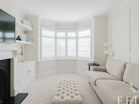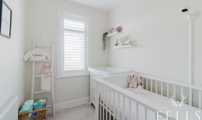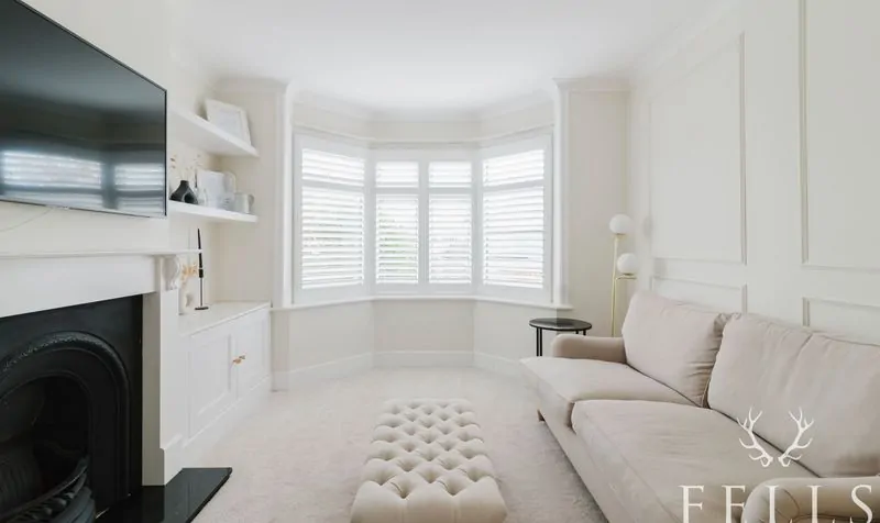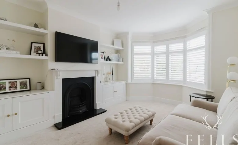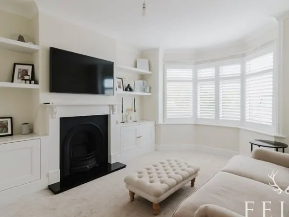 At the front of the house, the sitting room is a cosy space with a bay window fitted with plantation shutters. This room features a cast iron fireplace with space above for a wall-mounted TV, along with bespoke alcove cupboards and shelves for extra storage.