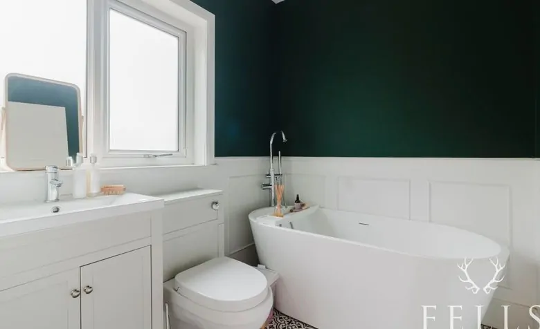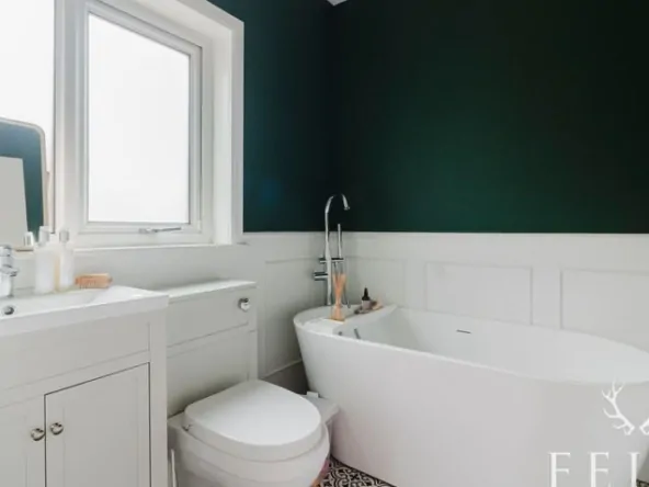 The ground floor also has a well-appointed bathroom with a freestanding bath, vanity unit, WC, and a heated towel rail, conveniently located near an under-stairs storage cupboard housing the Worcester combination boiler.