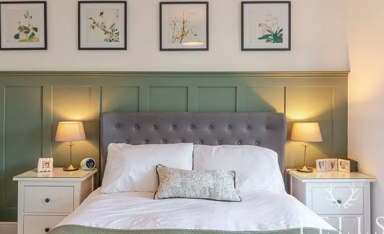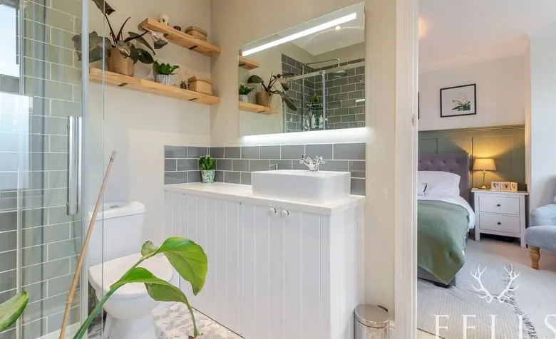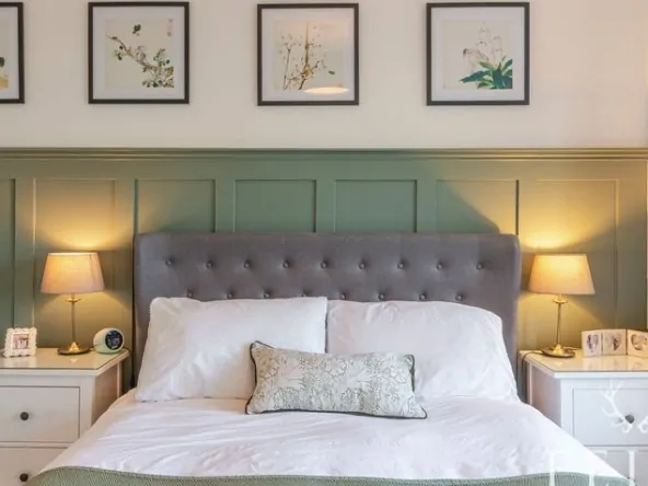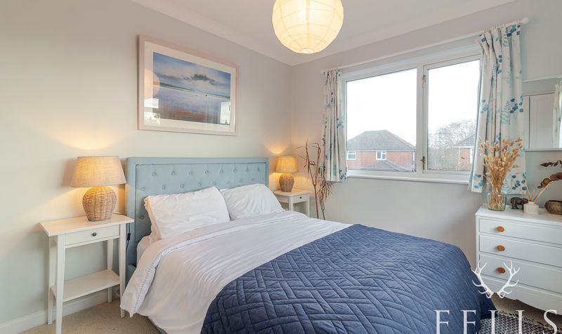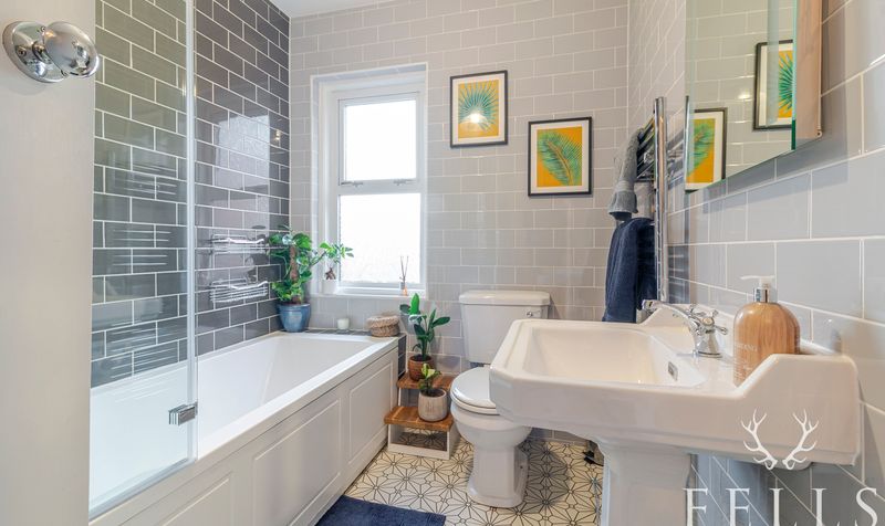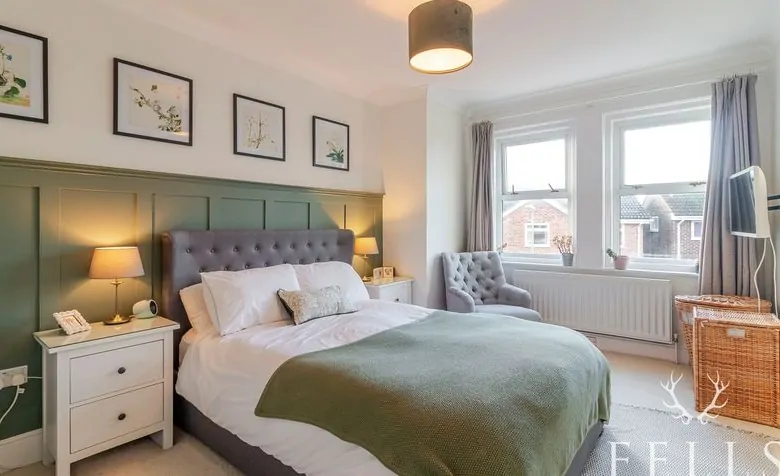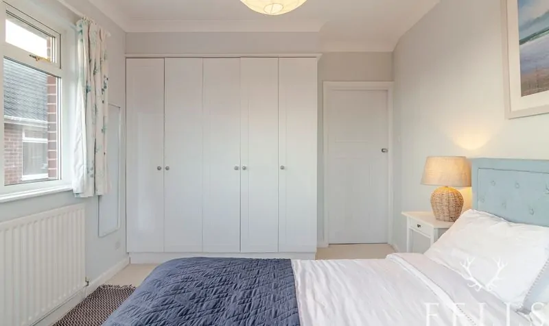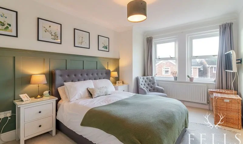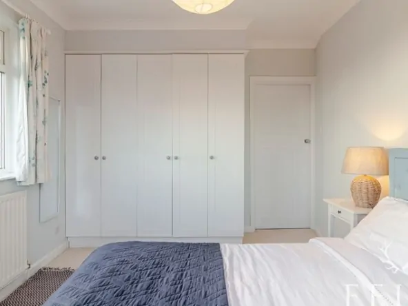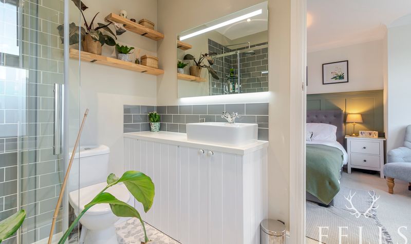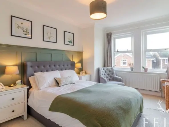 Upstairs, the first floor landing leads to three bedrooms and the family bathroom, all finished to an exceptional standard. The principal bedroom enjoys double front aspect windows and elegant panelling behind the bed, complemented by a luxurious ensuite featuring heritage fixtures, an oversized shower and a soft wash of natural light. The second bedroom is a bright double with fitted wardrobes and views across the garden, while the third offers built in storage and a peaceful setting for a nursery or study. The family bathroom, fully tiled and beautifully appointed, continues the home’s thoughtful design with its deep bath, rain style shower and classic sanitary ware.