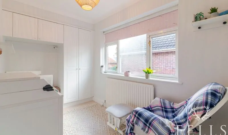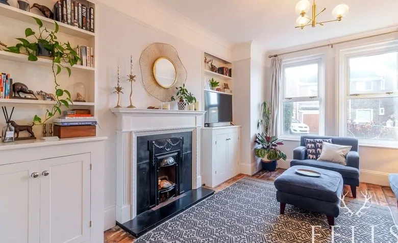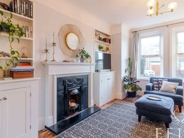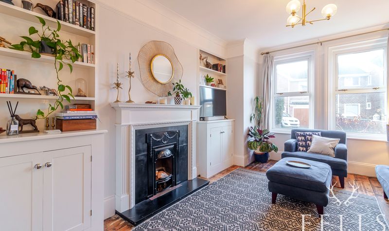 The garden room provides an inviting place to unwind, with room for generous seating and a discreet storage cupboard that keeps everyday essentials tucked from sight. The dining area, equally bright, sits between this space and the living room where double windows illuminate polished floorboards, a cast iron fireplace that serves as an attractive decorative feature and bespoke alcove cabinetry. It is a space shaped for relaxed gatherings and easy everyday living.
