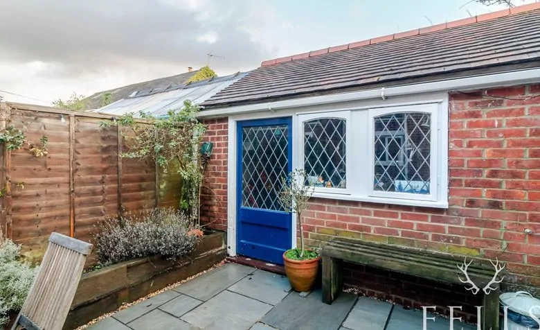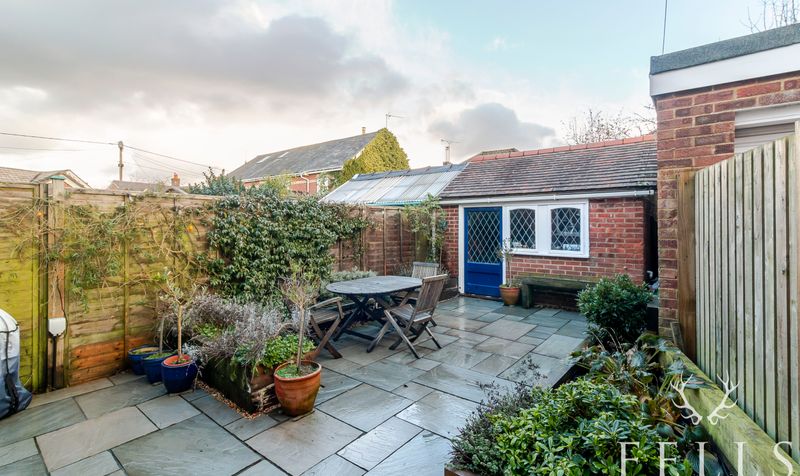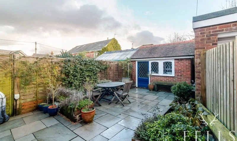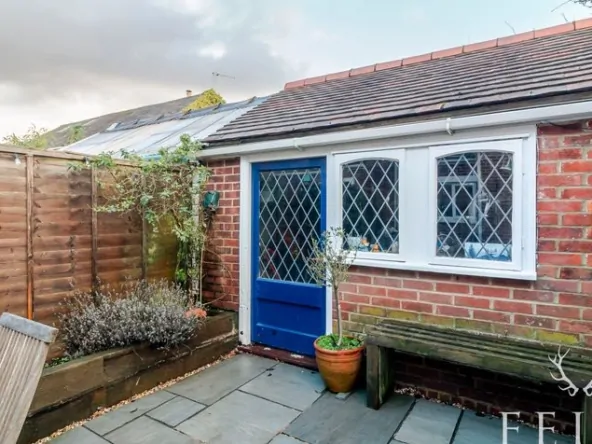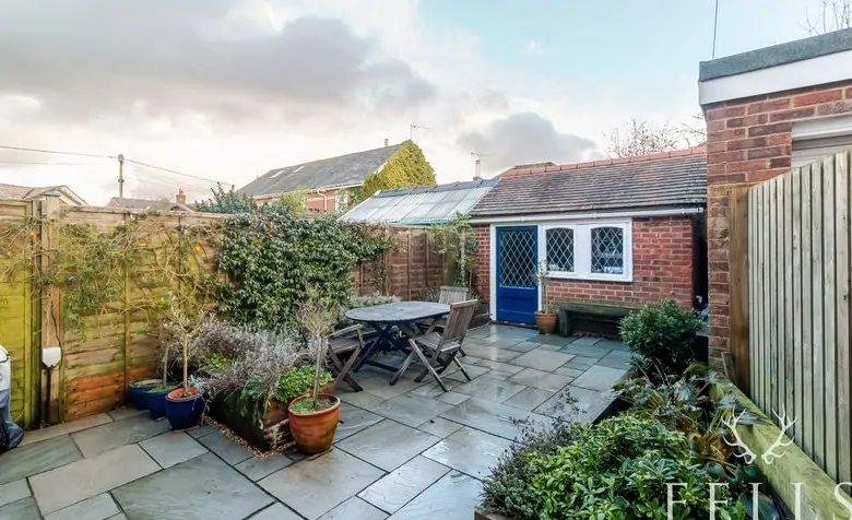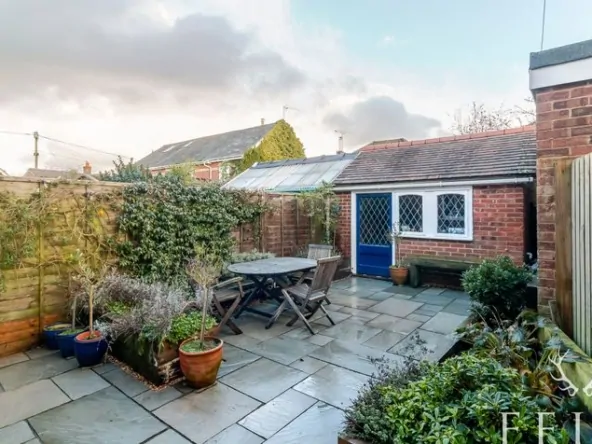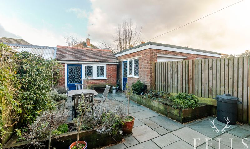 Outside, the property enjoys a resin driveway with space for two vehicles, along with right of way access to a semi detached garage complete with power, lighting and a side pedestrian door. A timber gate from the driveway leads into the rear garden which has been designed for low maintenance outdoor living. The whole garden is laid to patio, creating a generous and effortless setting for dining and entertaining, softened by raised sleeper edged borders and complemented by a brick built outbuilding with a glazed door and dual windows that could serve as a studio, hobby space or garden retreat.