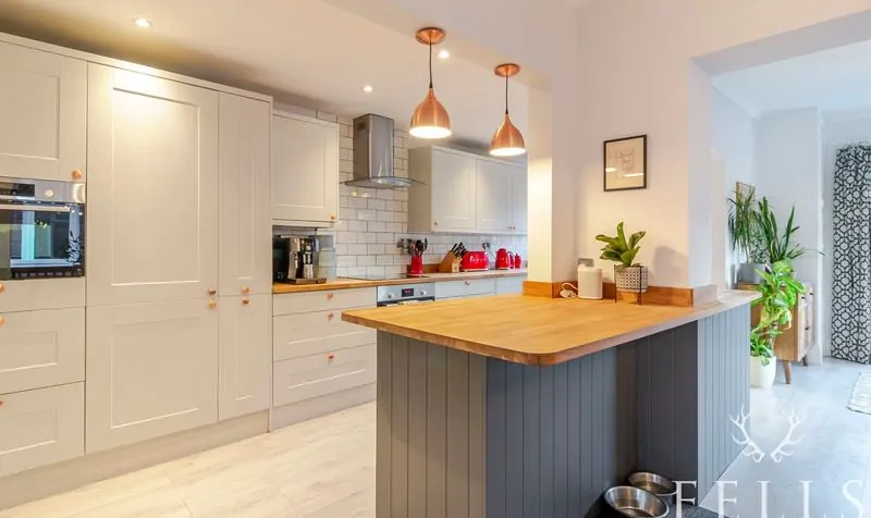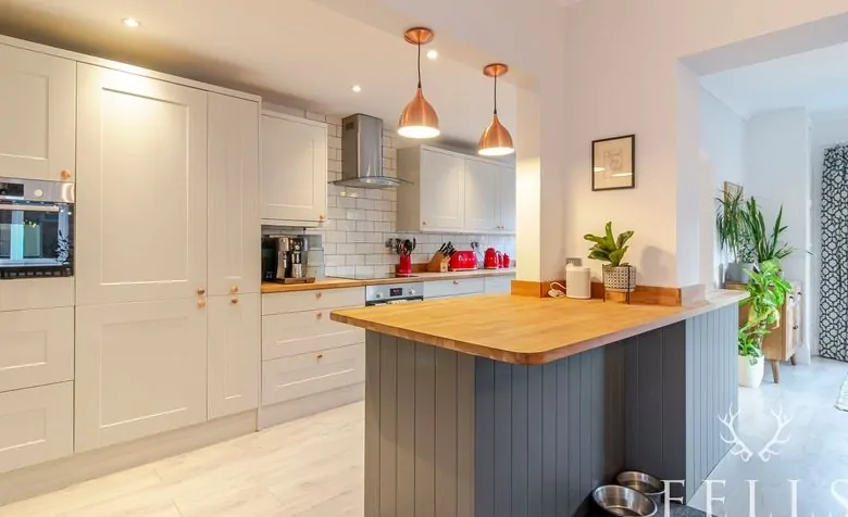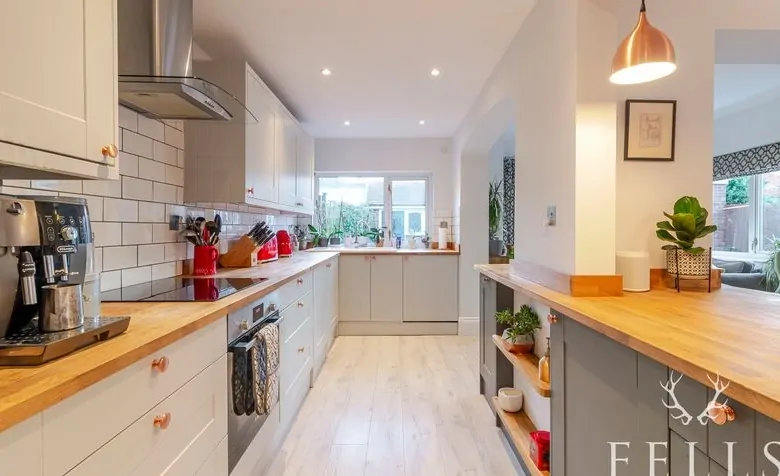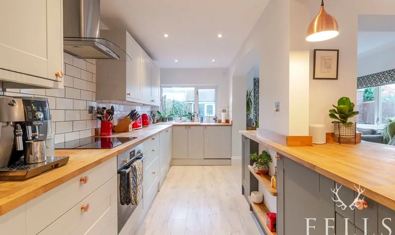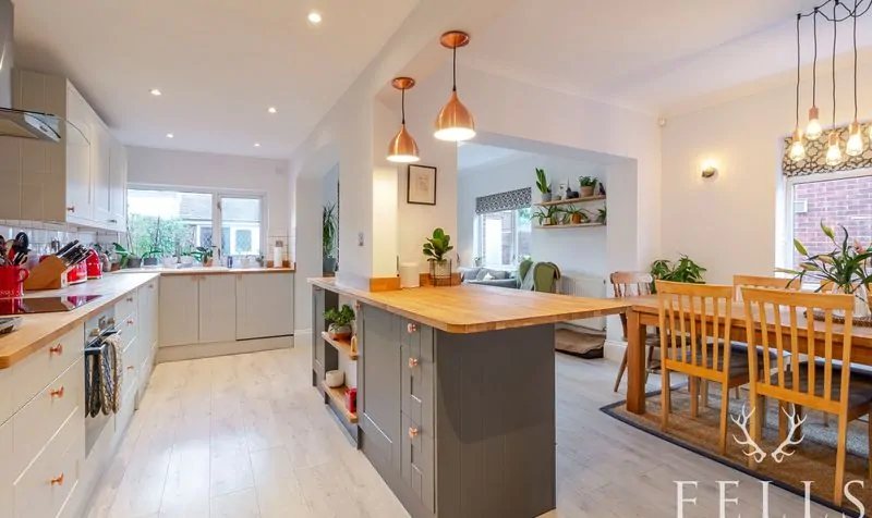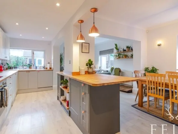 The heart of the house is the expansive open plan kitchen dining garden room area, a beautifully curated space that encourages slow mornings, family gatherings and relaxed evenings. The shaker style cabinetry, solid wood worktops and central island create a warm yet refined aesthetic, while a suite of integrated appliances ensures modern convenience sits seamlessly alongside the more traditional details. Light pours in from the rear garden, drawing the eye toward the glazed door and offering a pleasing connection between indoors and out.