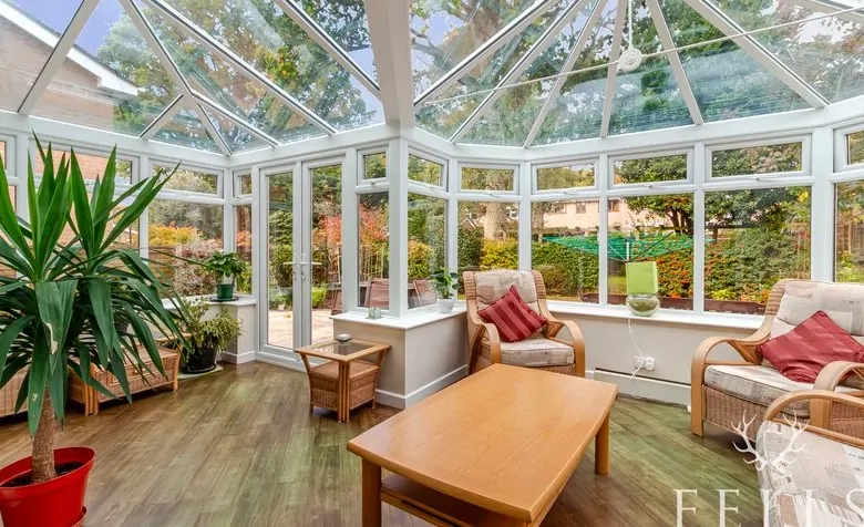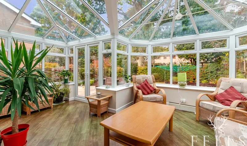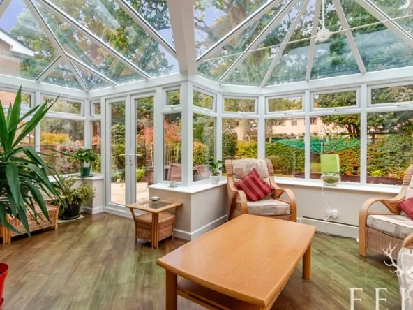 The kitchen and dining area is the real hub of the home. There is plenty of space to cook, eat, and spend time together, with doors that open out to the patio for summer meals or a morning coffee in the sun. The living room leads through to the conservatory, where the garden almost feels like part of the house, filling the space with natural light and a calm outlook over the lawn and planting beyond.