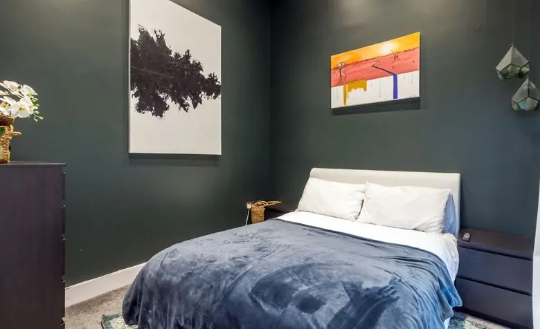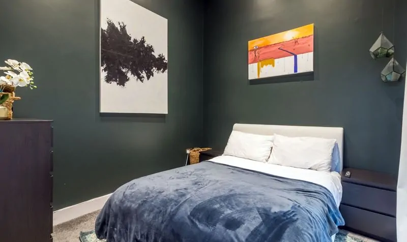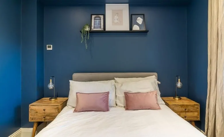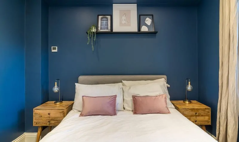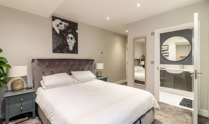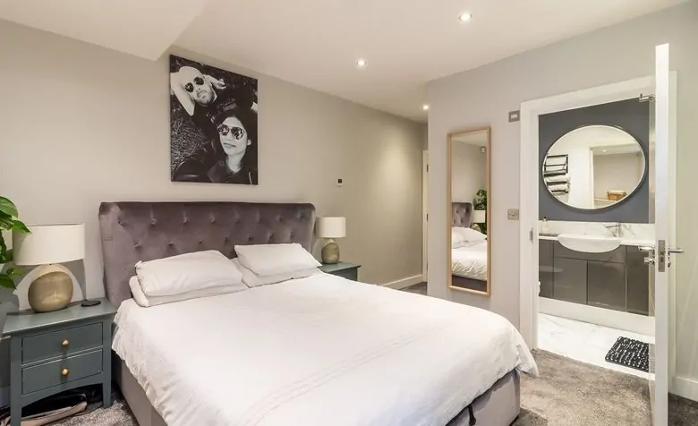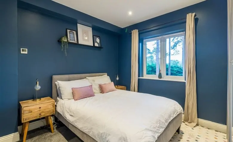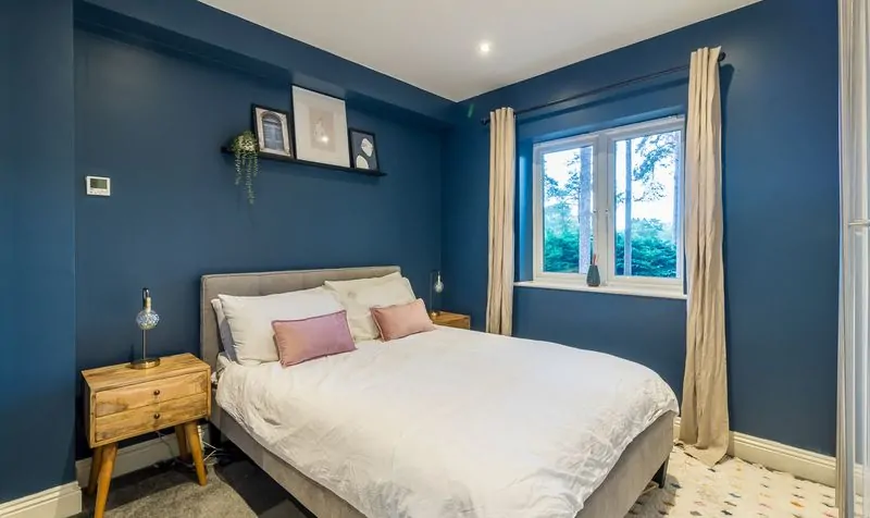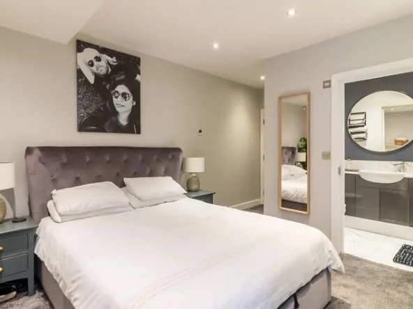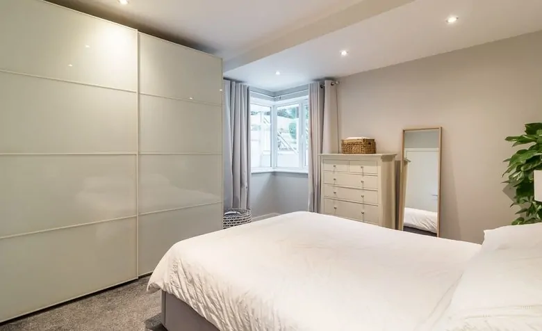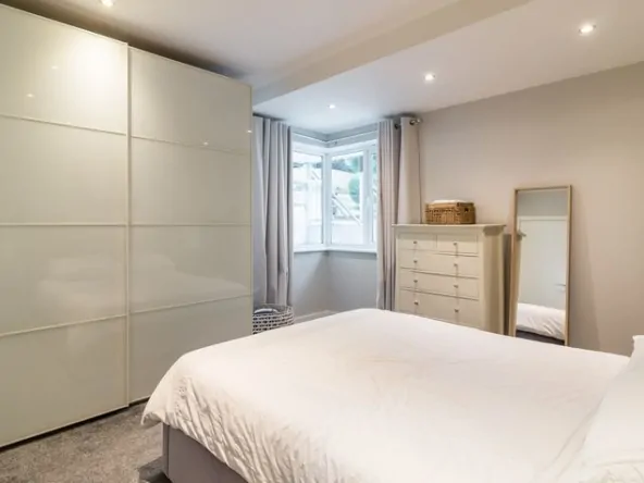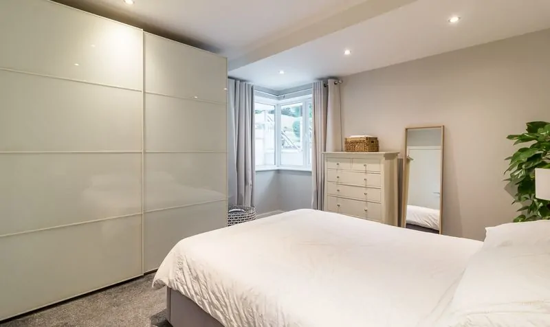 A double bedroom with fitted double wardrobe with opaque glazed sliding doors. Door leads to the ensuite shower room.