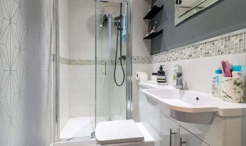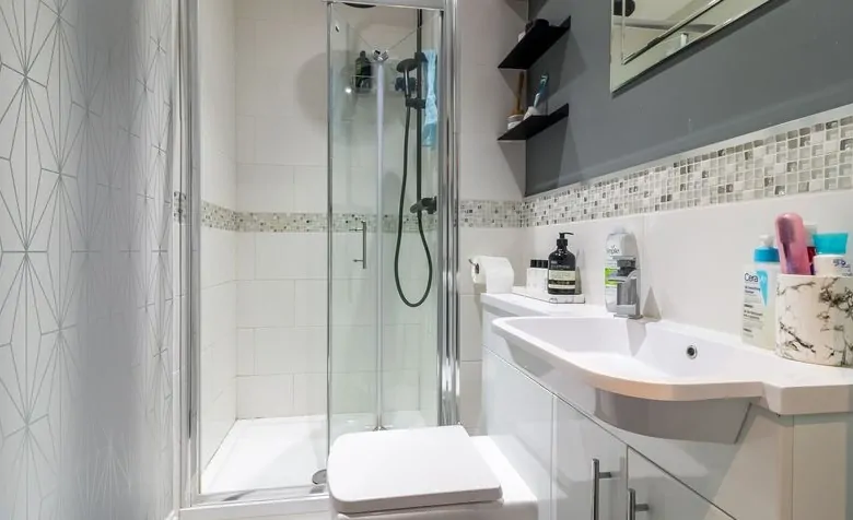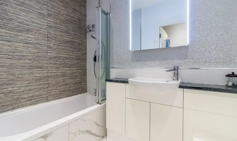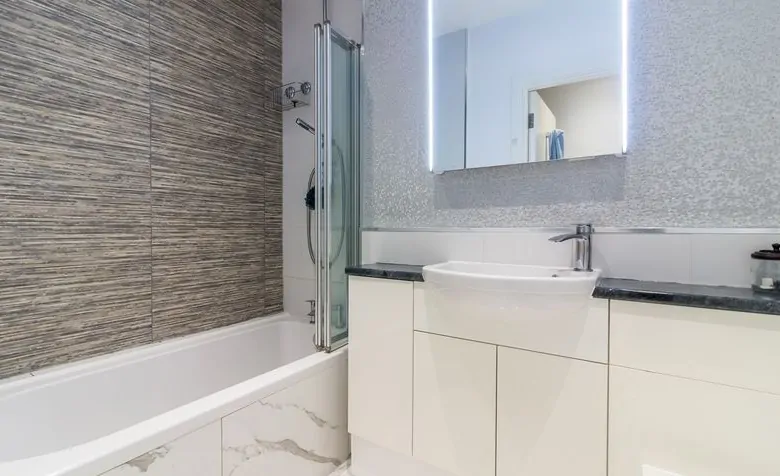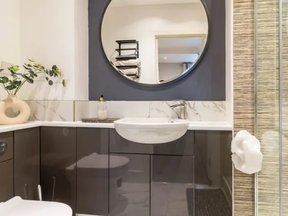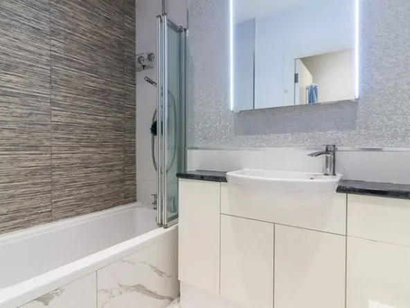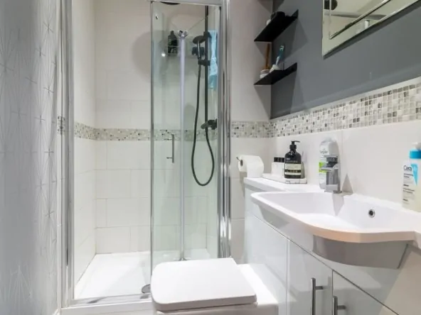 Fully tiled shower cubicle with sliding glazed screen door. Thermostatic shower valve with a large square head. Vanity unit with back lit mirror above. Low flush wc with concealed cistern. Electric heated towel rail. Porcelain tiled floor.