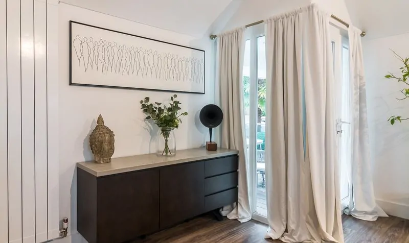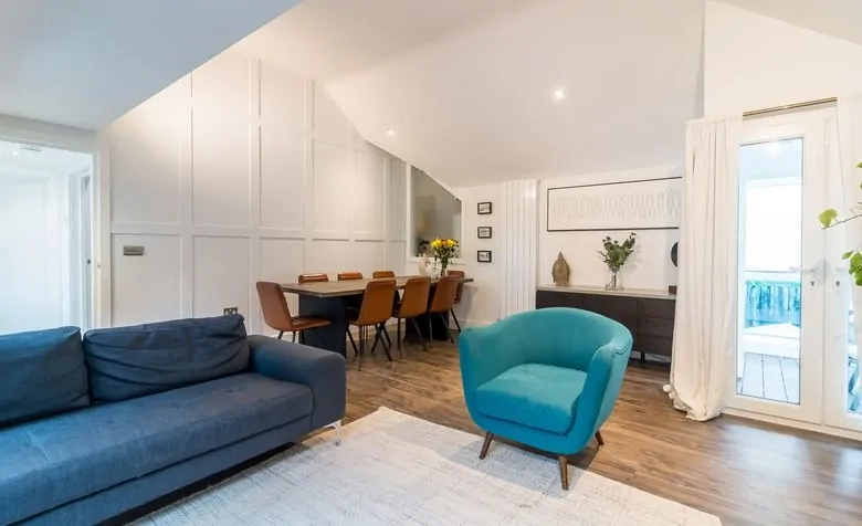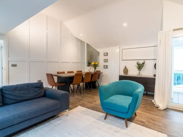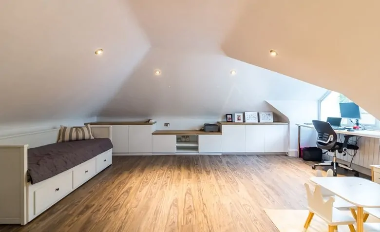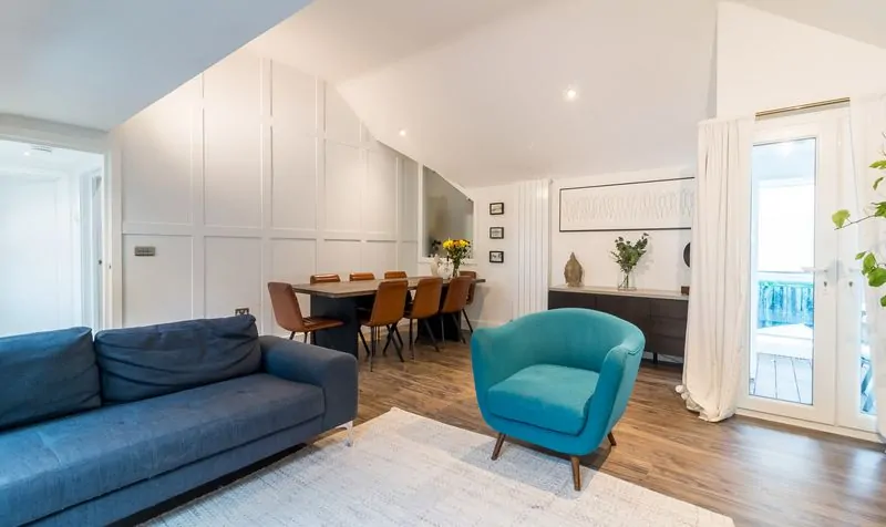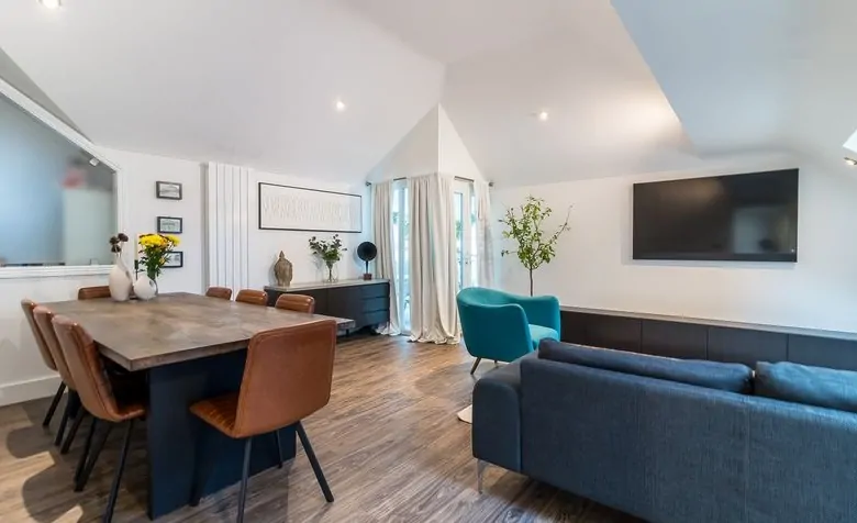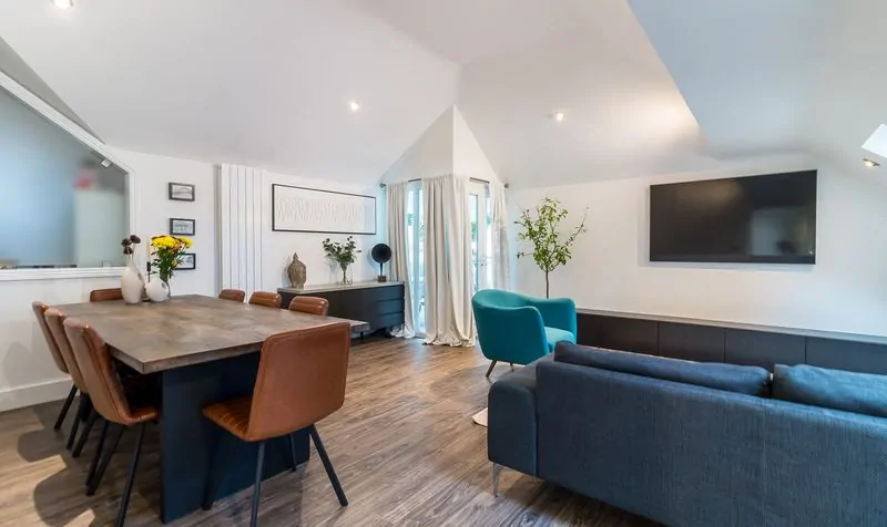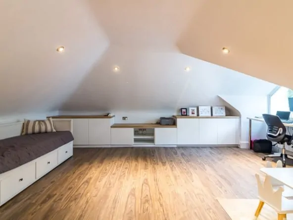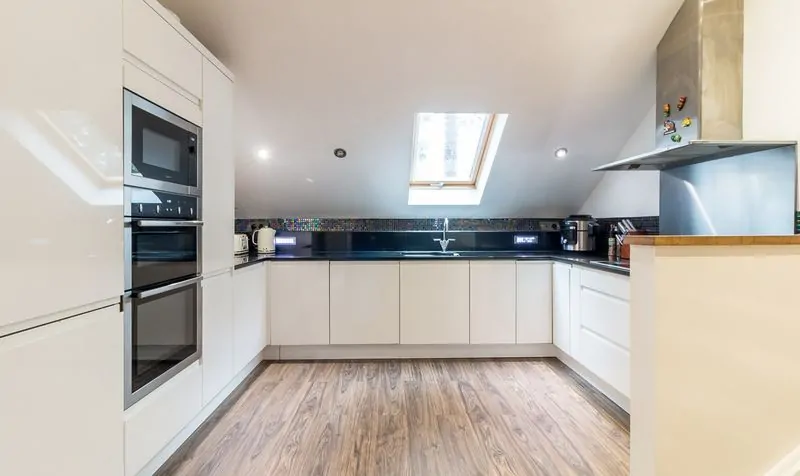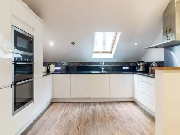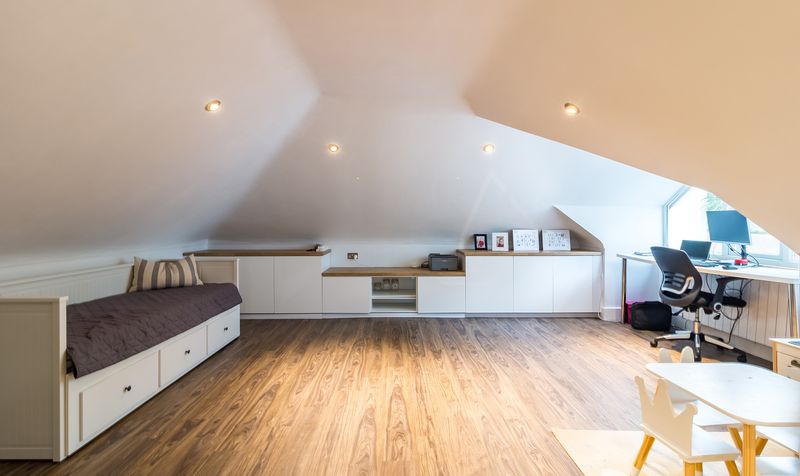 A spacious light and airy space with a vaulted ceiling. Corner arrangement of reclaimed wooden shelves. Click LVT flooring. Two velux double glazed sky light windows with integral blinds to the rear elevation. Double glazed French doors lead out onto a South Westerly aspect sun deck balcony with composite decking and tinted glass balustrade.