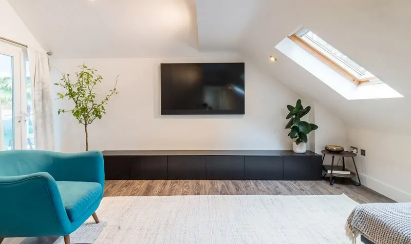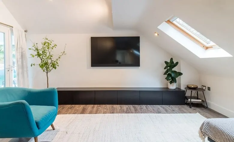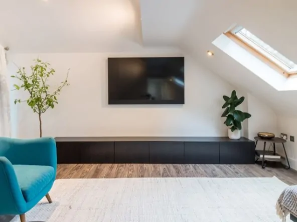 A large bright and airy room with a fitted media cabinet with fitted shelving to either side. Apex window to front aspect.