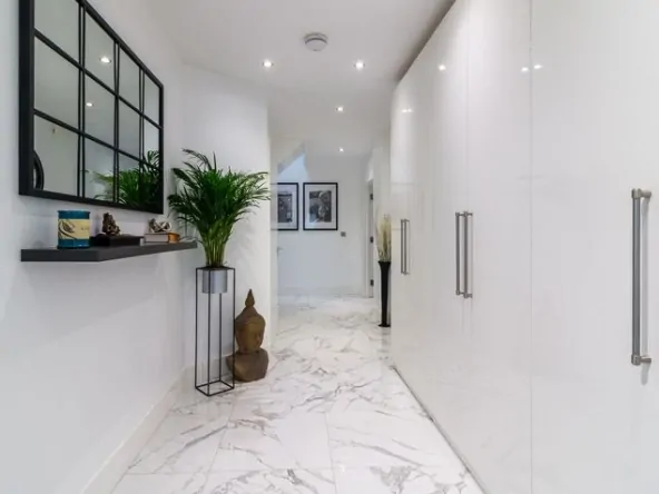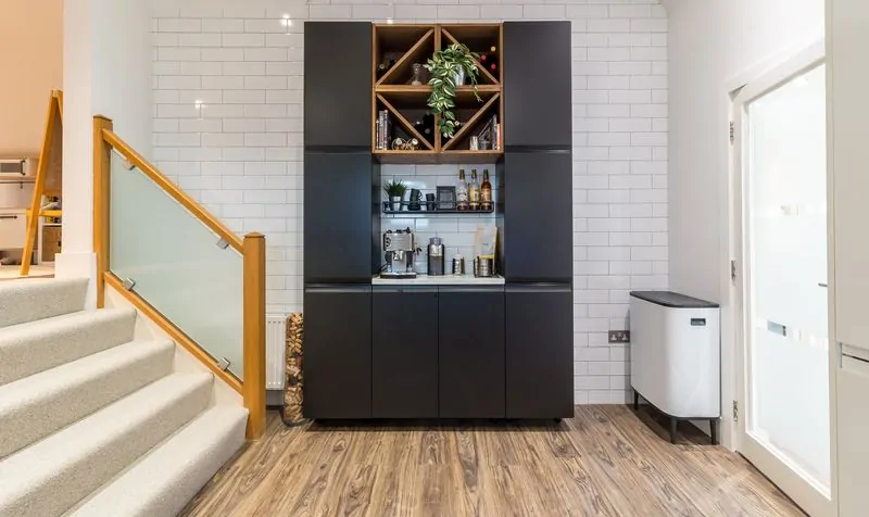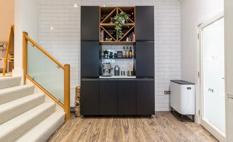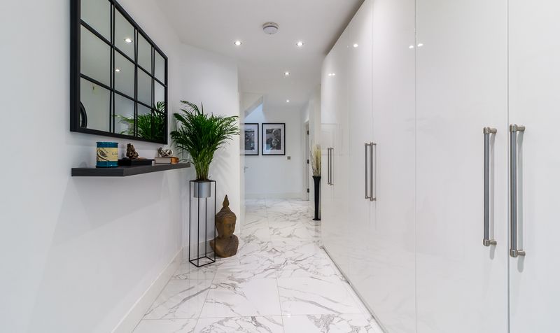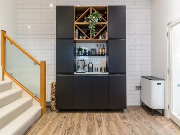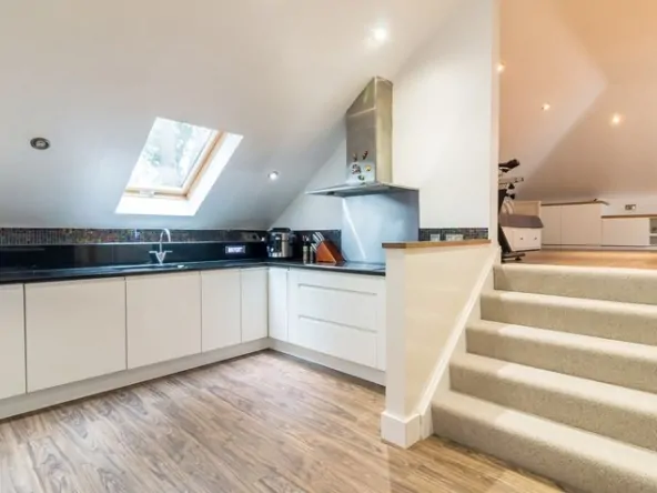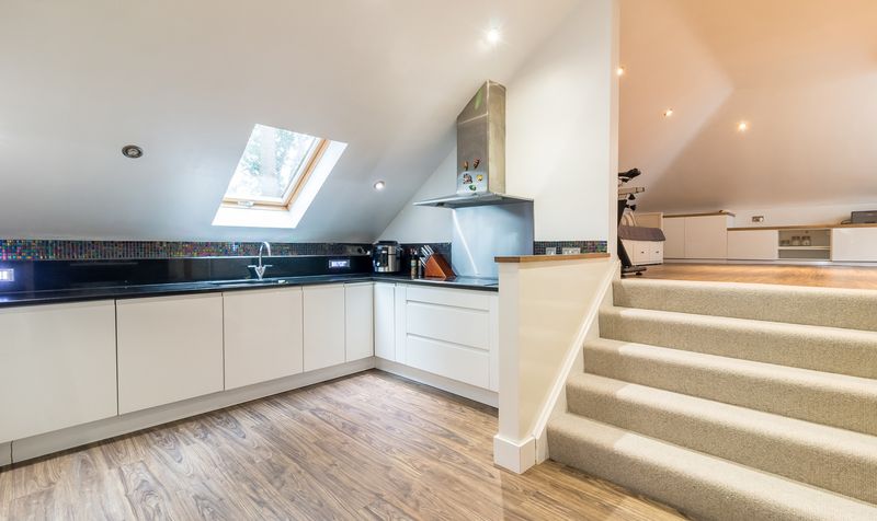 Polished black granite work surfaces with back stands. Under mounted one and a half bowl stainless steel sink unit. Integrated Neff dishwasher. Inset Neff five ring electric hob. Neff Chimney style extractor above with multi-speed fan/light. Integrated ‘eyeline’ Neff fan assisted electric oven/grill and microwave oven. Adjacent integrated tall fridge freezer. Shelved larder cupboard. Integrated wine fridge. Beneath the work surfaces are a comprehensive range of quality white gloss finish cupboards, drawers and pan drawer units incorporating several ‘magic corners’. Further work surface with cupboards acts as a coffee station. Vaulted ceiling. Click LVT flooring. Steps lead up to the Office/Play Room.