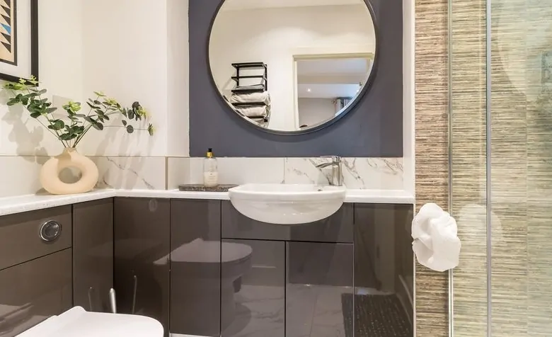 Contemporary style white sanitary ware. Half tiled. Low flush wc. Vanity unit. Porcelain tiled floor.