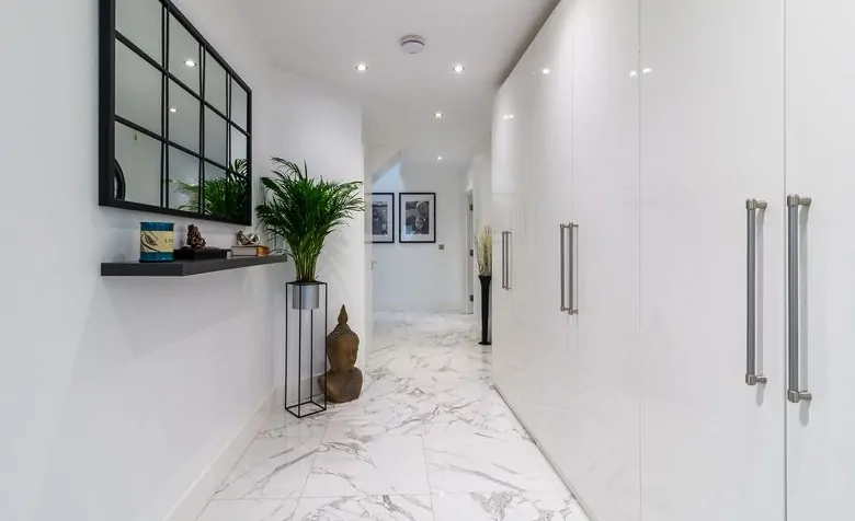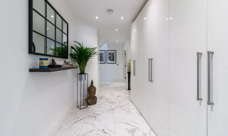 Porcelain tiled floor. Three white gloss finish double fitted cupboards. Upvc double glazed French doors lead directly onto a raised decked verandah and the wrap around decked patio. Contemporary style white internal doors.