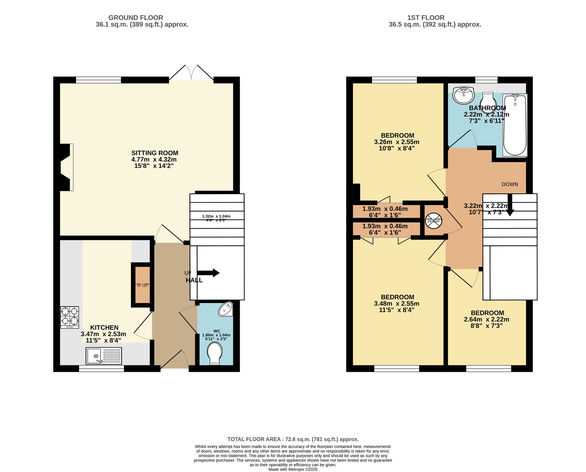 At the rear, the bright living room enjoys French doors opening out to the garden, creating a seamless connection between indoor and outdoor living. There’s also a useful ground floor cloakroom and a storage cupboard tucked neatly under the stairs.