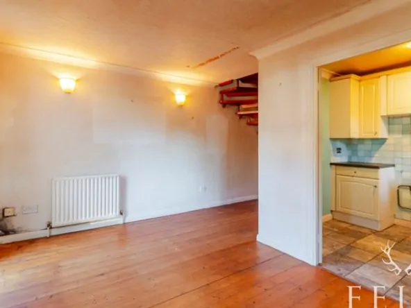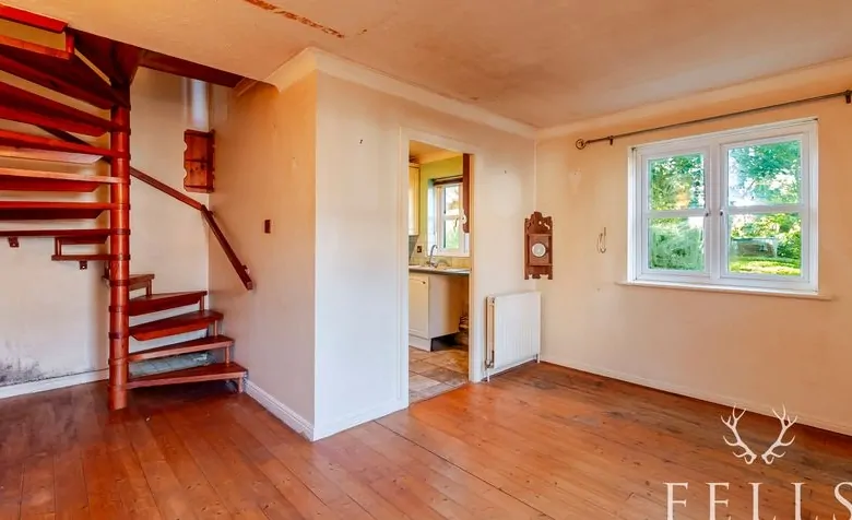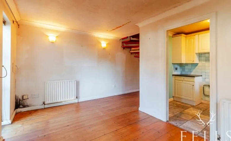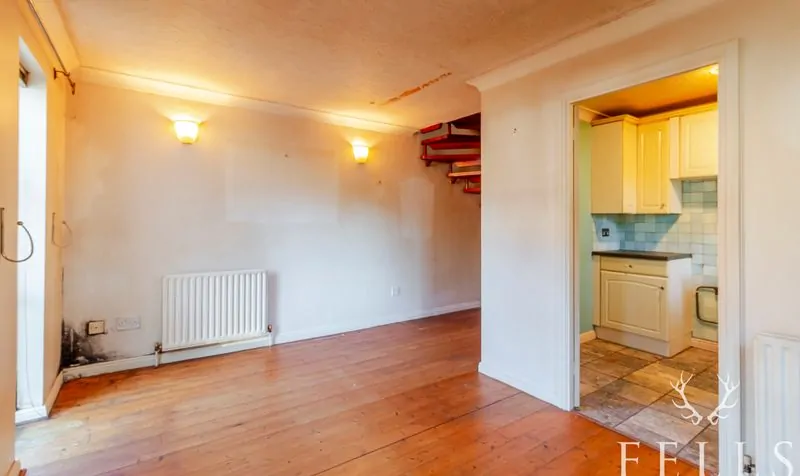 A glazed entrance door opens to the living room, where a floor-to-ceiling window and side aspect window bring in plenty of natural light. Original wooden floorboards give character to the space, while a spiral staircase rises to the first floor. The kitchen adjoins the living room and provides a practical layout with base and wall cabinets, space for appliances, and a side aspect window. Within one of the cupboards sits the Vaillant boiler, and a tiled floor completes the room.