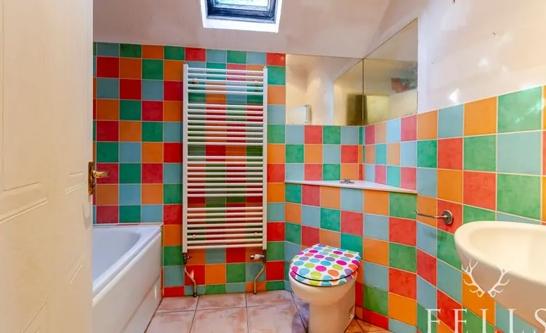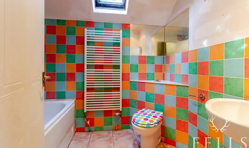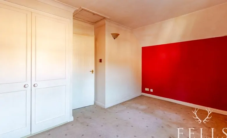 Upstairs, the landing gives access to a double bedroom with fitted wardrobes and loft access. The bathroom includes a panelled bath with thermostatic shower, corner pedestal basin, WC, and heated towel rail. An airing cupboard with hot water cylinder and shelving offers further storage.