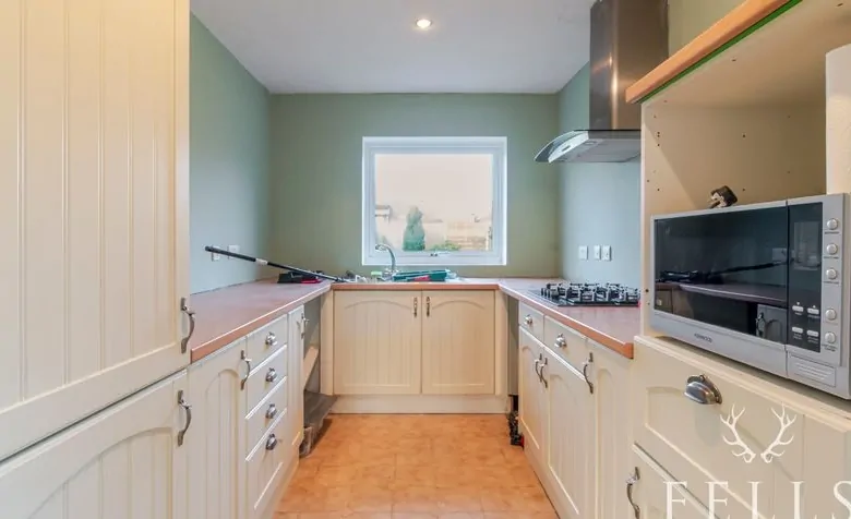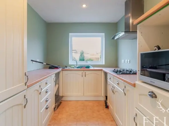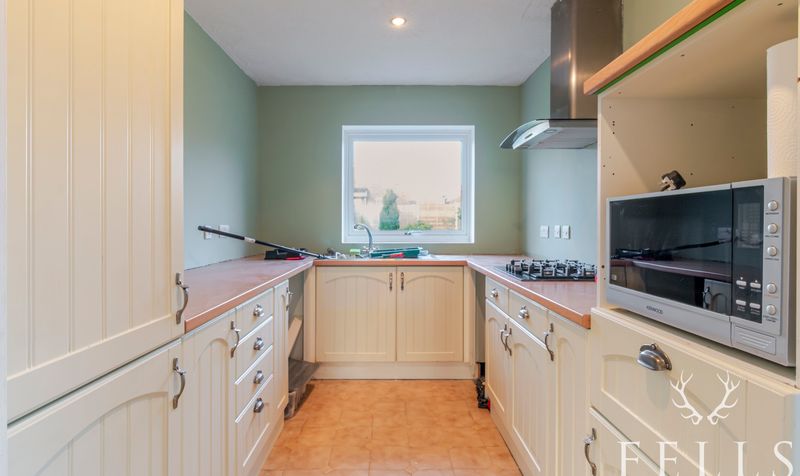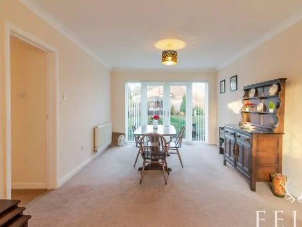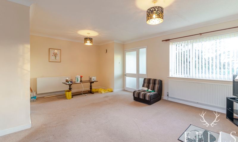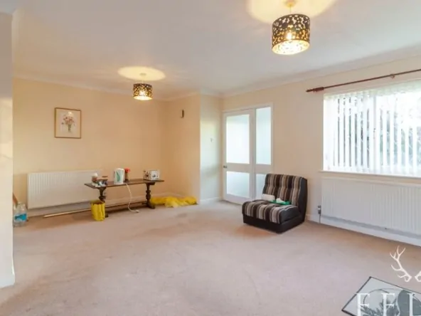 A welcoming entrance porch opens into a generous open plan lounge and dining room, a light filled space that feels instantly inviting. The fireplace forms a natural focal point, while French doors from the dining area draw the garden into everyday living, making it easy to imagine relaxed mornings and long summer afternoons spent outdoors. From here, a connecting door leads into the kitchen, fitted with a range of base level cupboards and enjoying views across the rear garden, with additional access out to the side and rear of the property.